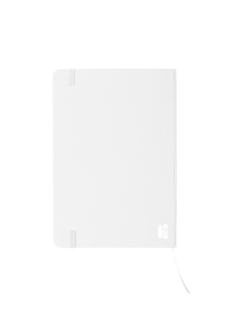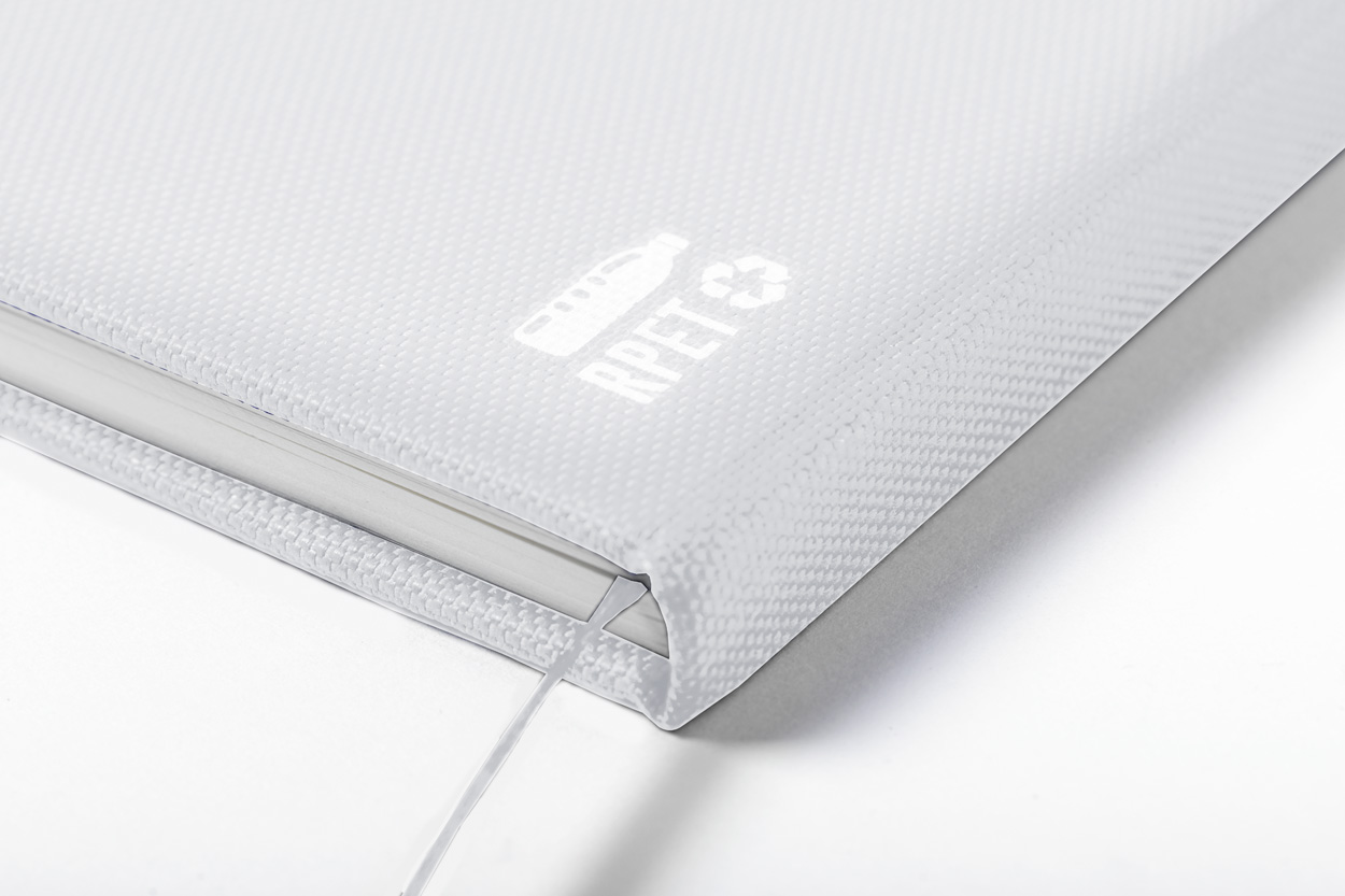 RPET polyester covered notebook with 80 lined sheets, bookmark and rubber strap. A5 size.