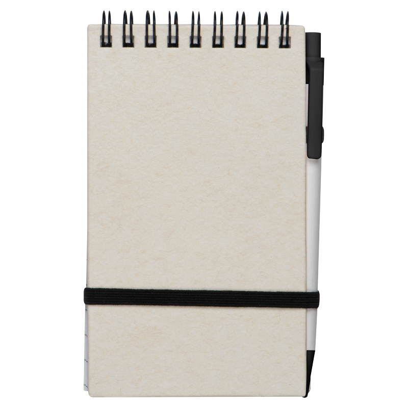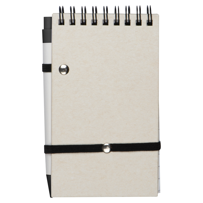 Eco friendly notebook made of recycled milk carton! Spiral notepad with 140 lined pages, rubber strap and blue ballpoint pen.