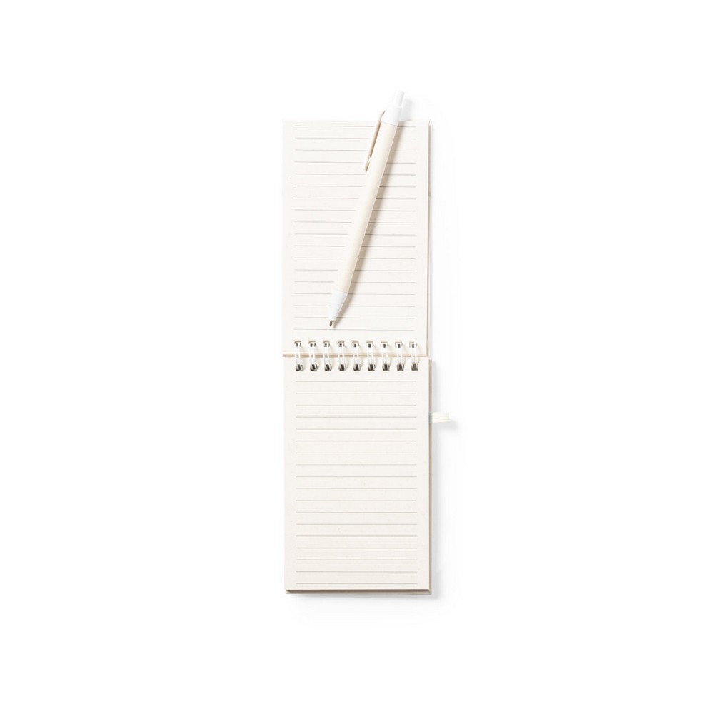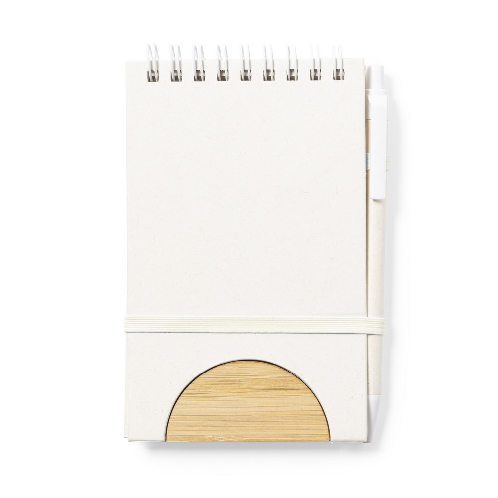Notebook (approx. B7, 80 lined sheets) made from recycled milk cartons, bamboo detail, hard cover that can be used as phone stand, elastic band for closing, ball pen with barrel made from recycled milk cartons and white details included