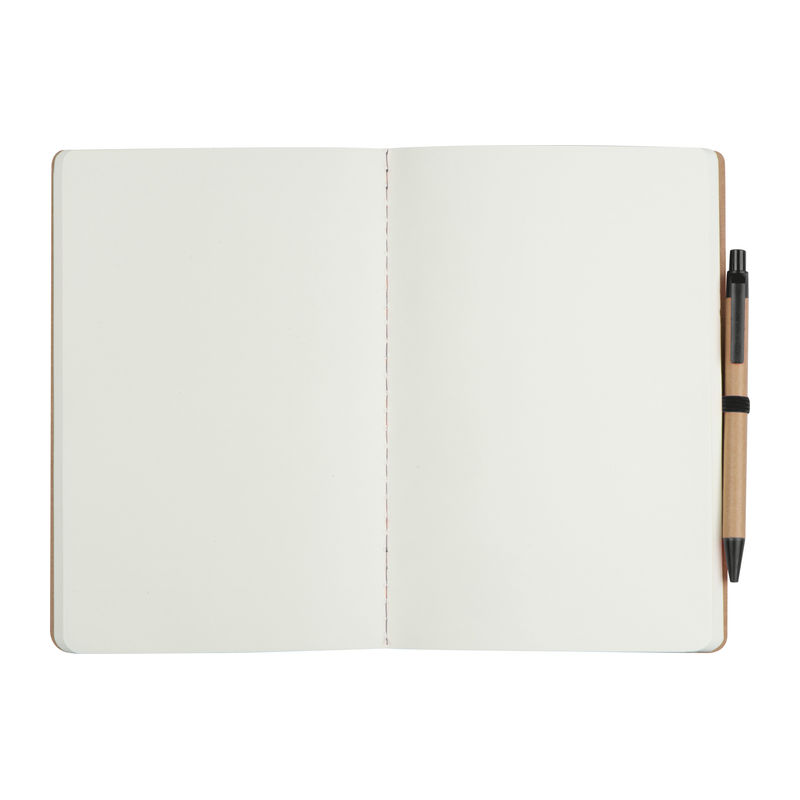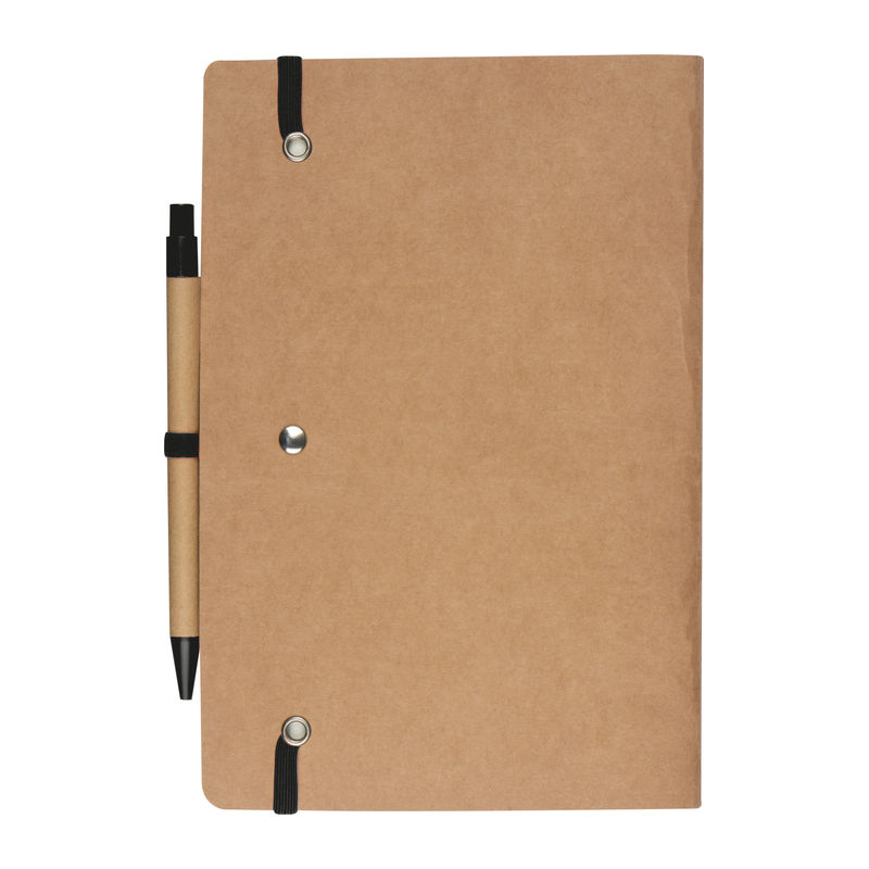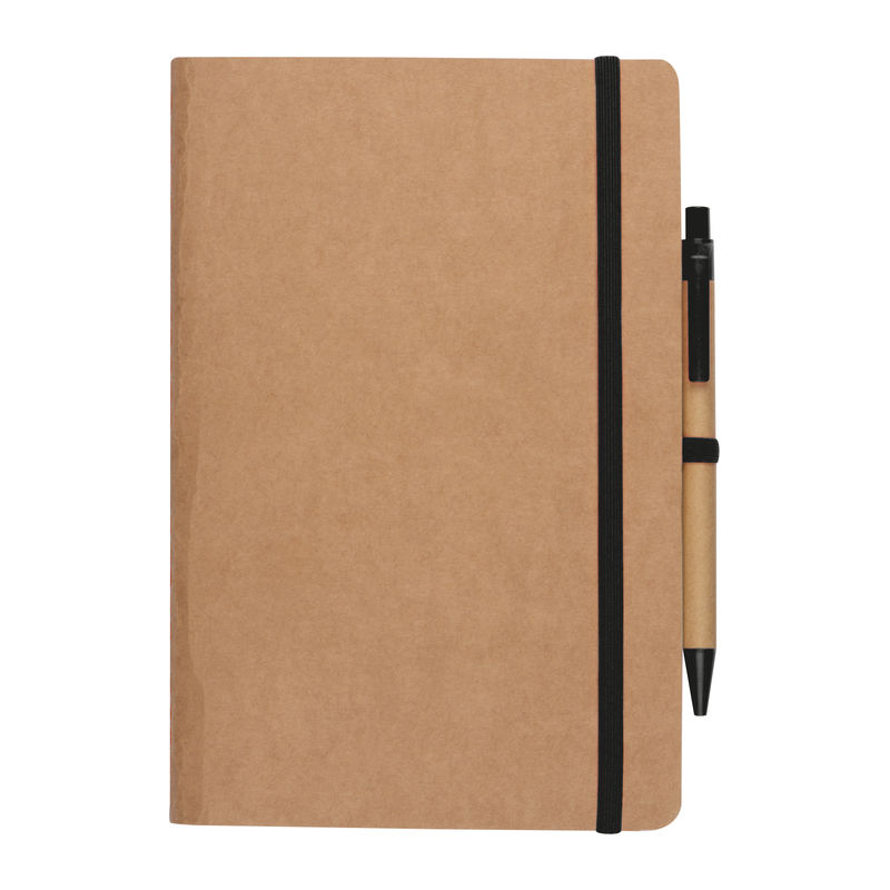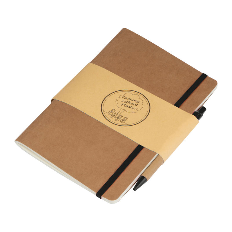 A5 notebook made of recycled paper with 120 pages, elastic band for closing and pen loop incl. ball pen with blue writing refill. Your logo is printed on the cover.