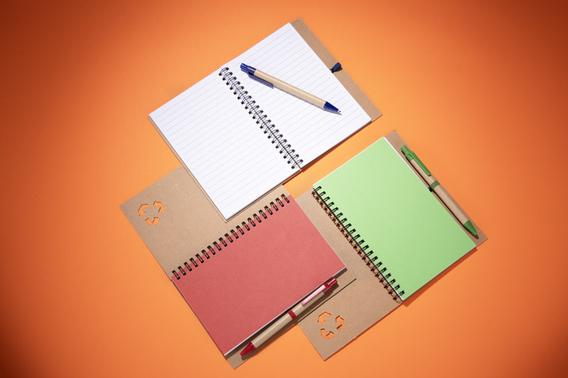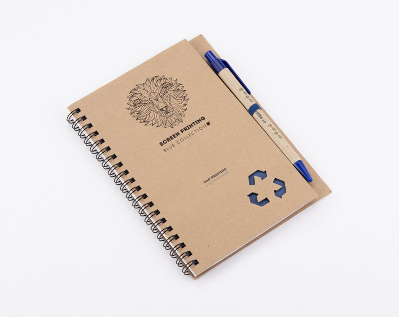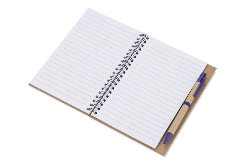 SERENO is a spiral notebook with a classic paper cover. It has 70 lined pages. The notepad is accompanied by a ballpoint pen with a profiled paper body. The pen's finish matches the colour of the notebook's divider. Blue pen refill.