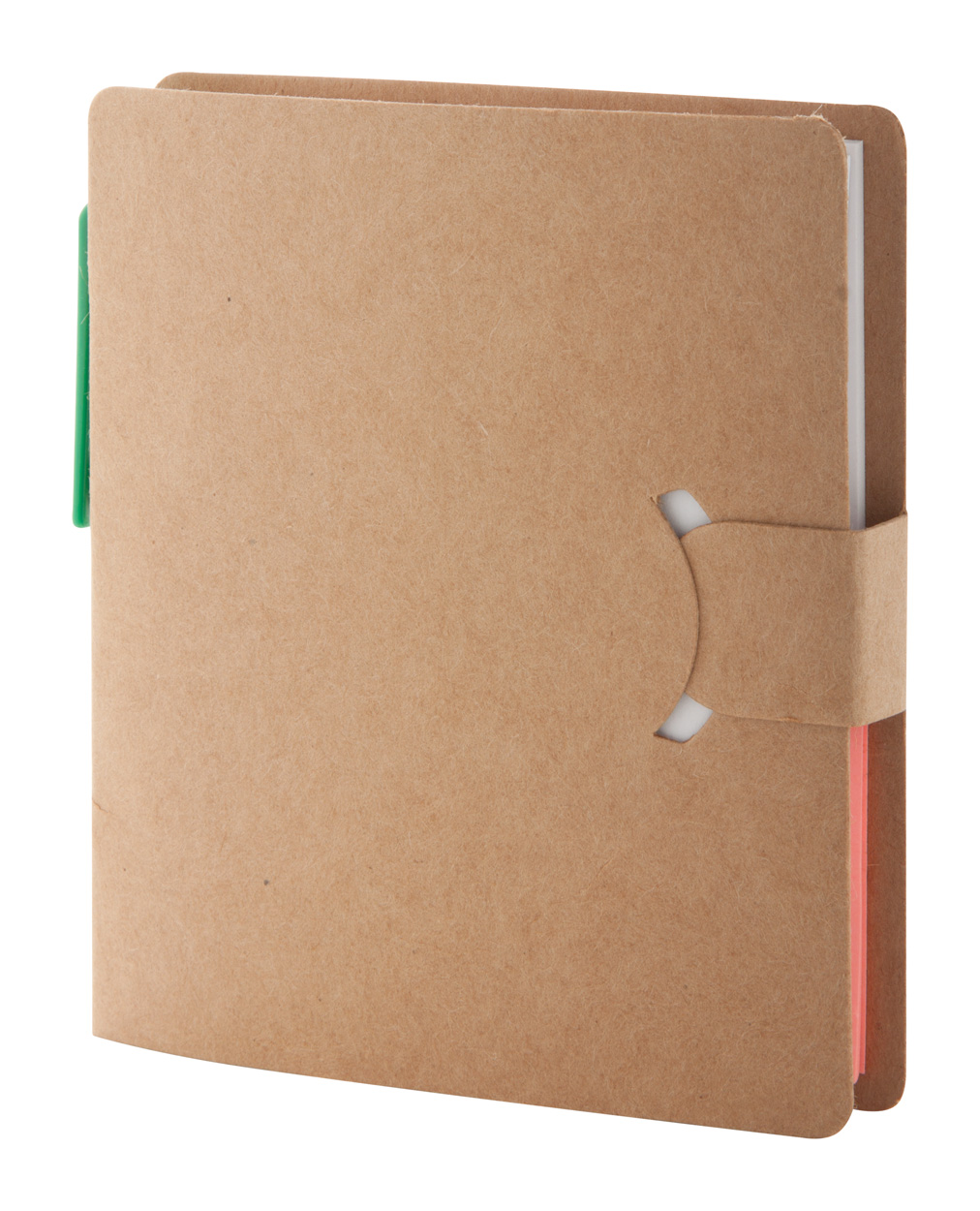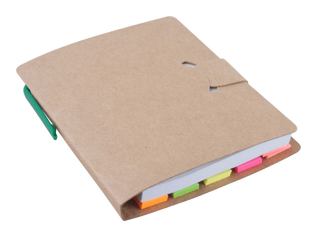 225 sticky notes in different sizes with ballpoint pen in recycled paper case.