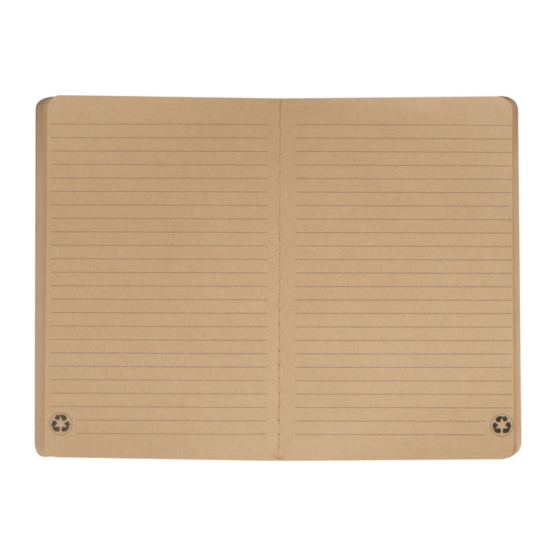 Recycled A5 notebook made of kraft paper with 120 lined pages, 70g/m². Your logo will be printed on the outside of the cover.