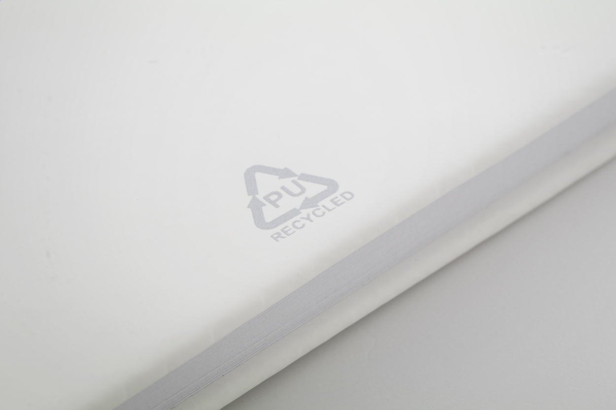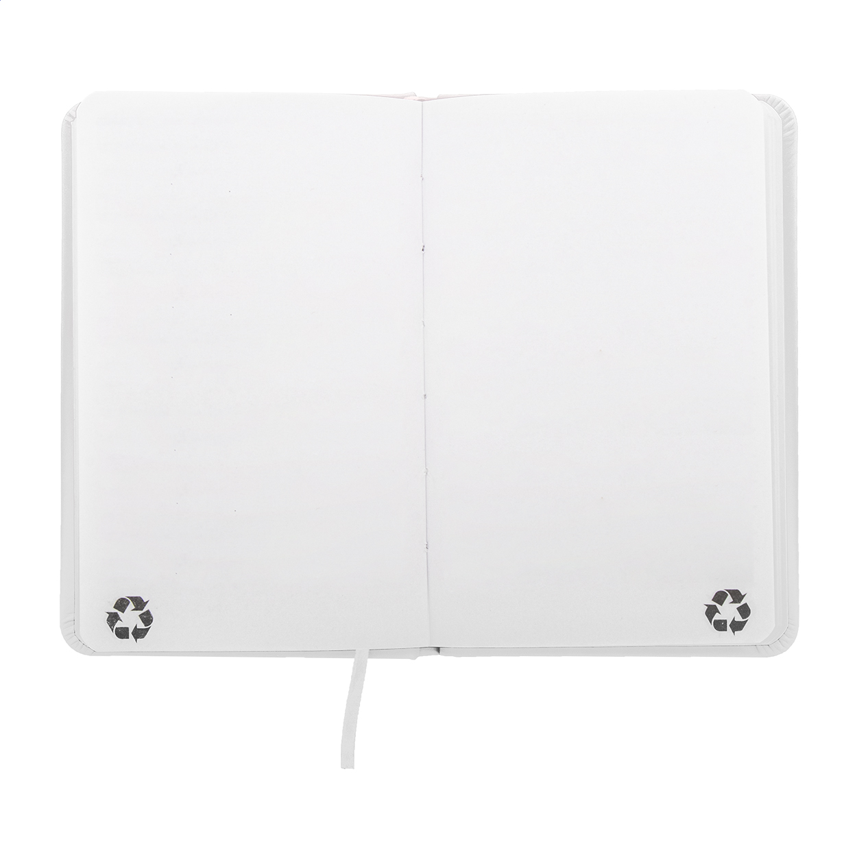Recycled PU leather covered notebook with 100 blank sheets in recycled paper. With matching colour bookmark and rubber band. A6 size.