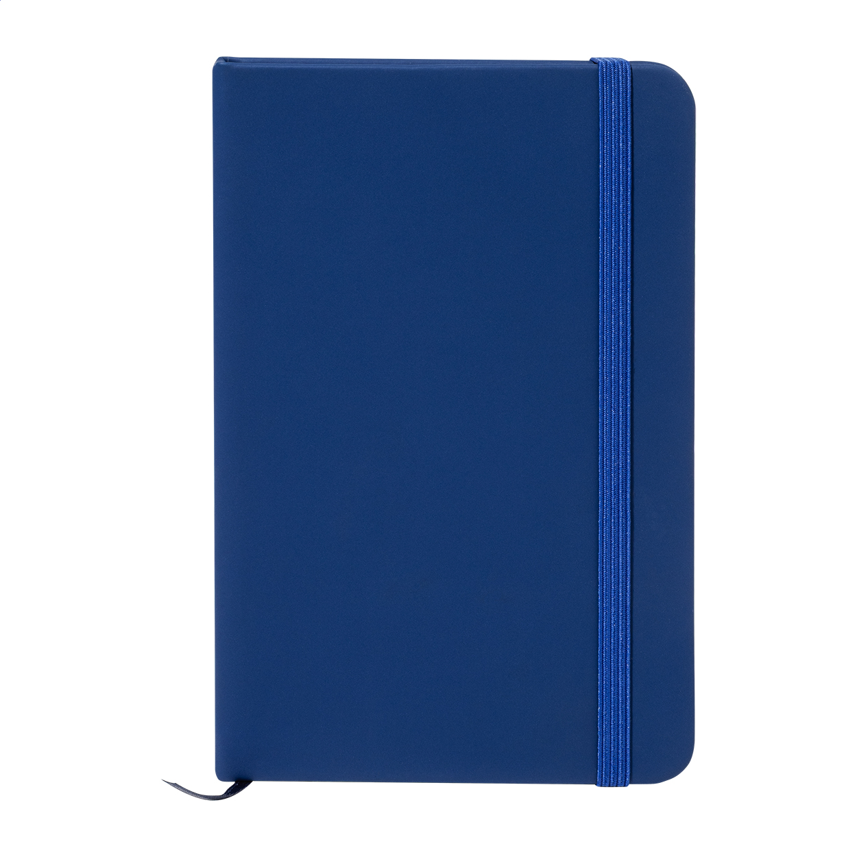 Recycled PU leather covered notebook with 100 blank sheets in recycled paper. With matching colour bookmark and rubber band. A6 size.