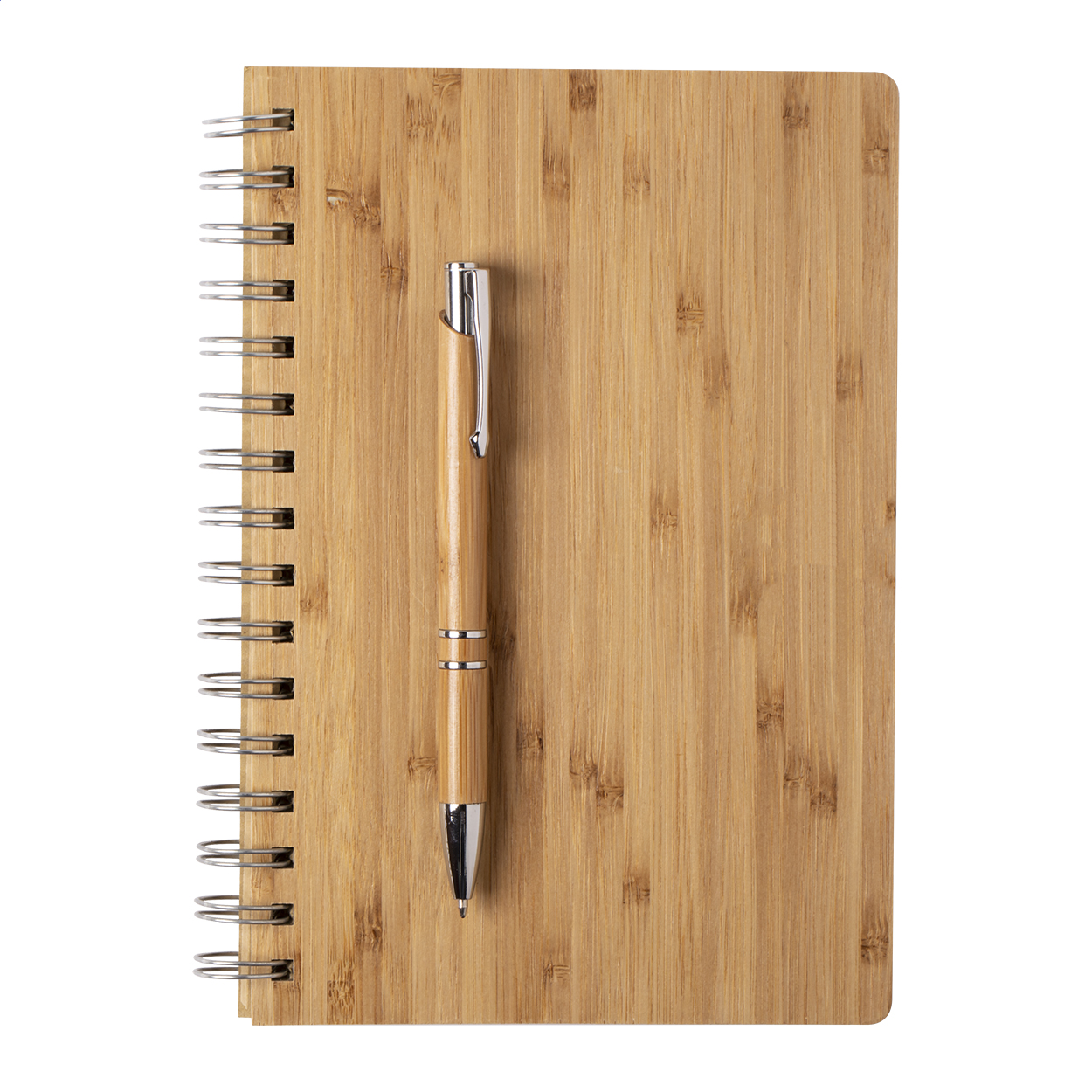 Bamboo covered spiral notebook. Including bamboo ballpoint pen with black refill. 80 lined sheets, A5 size. In kraft paper box.