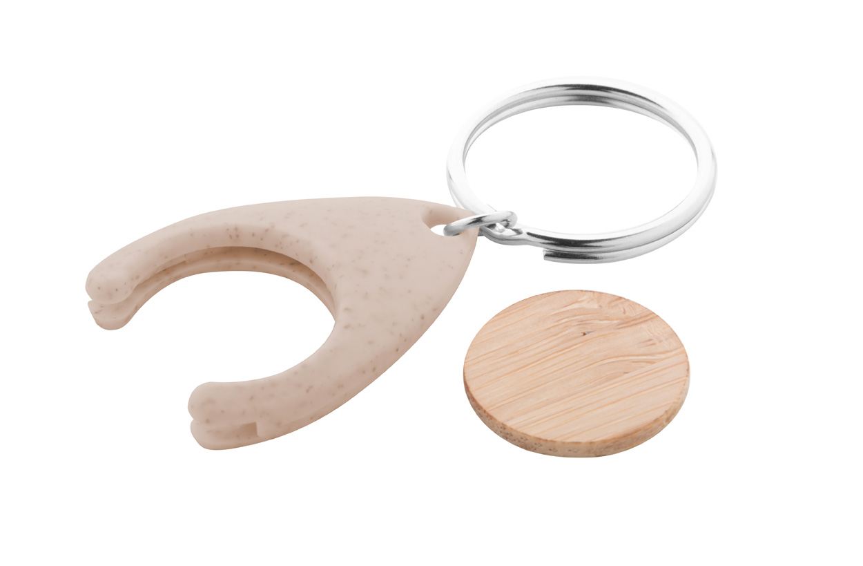 Bamboo shopping trolley coin in ecological wheat straw plastic keyring. Coin size: ø25×2 mm.
