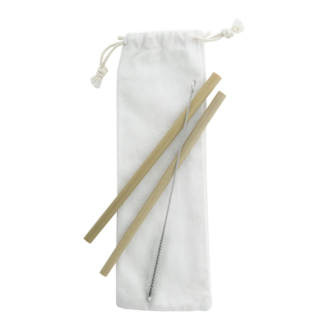 Set of 2 reusable natural bamboo drinking straws and cleaning brush in cotton pouch. The diameter and surface of the straws may vary.