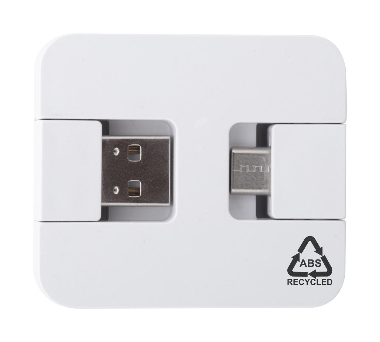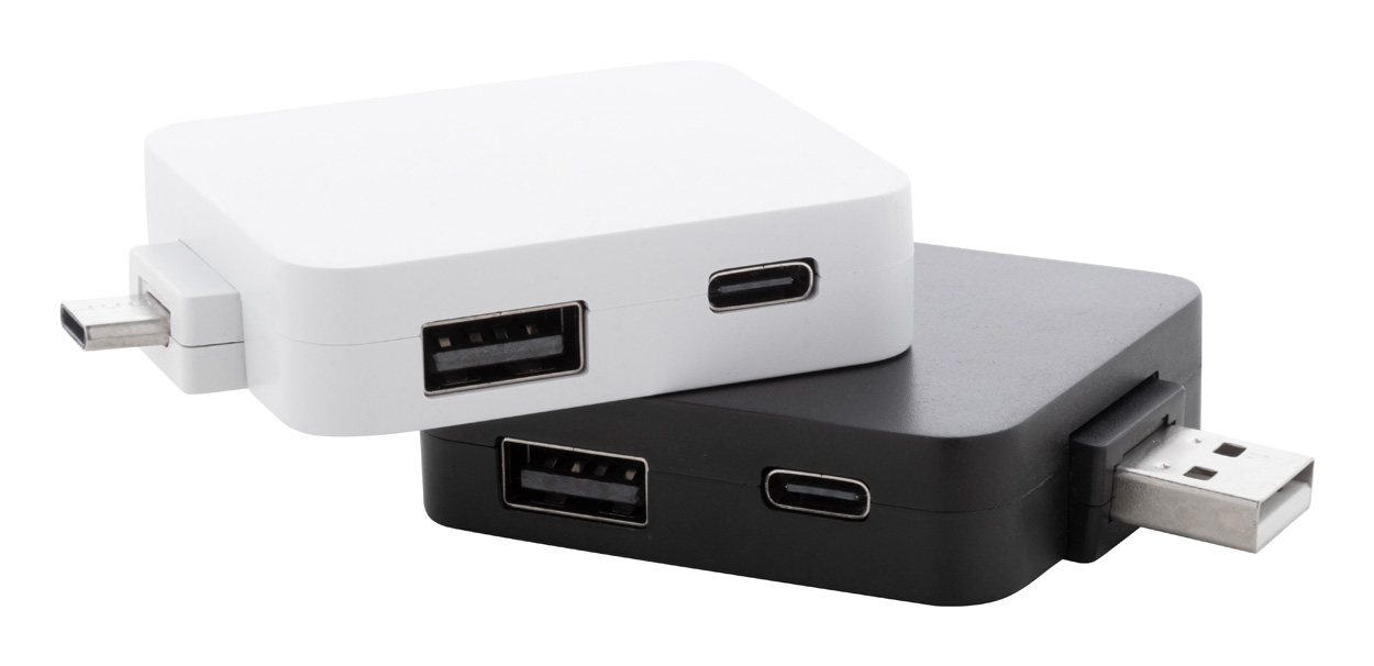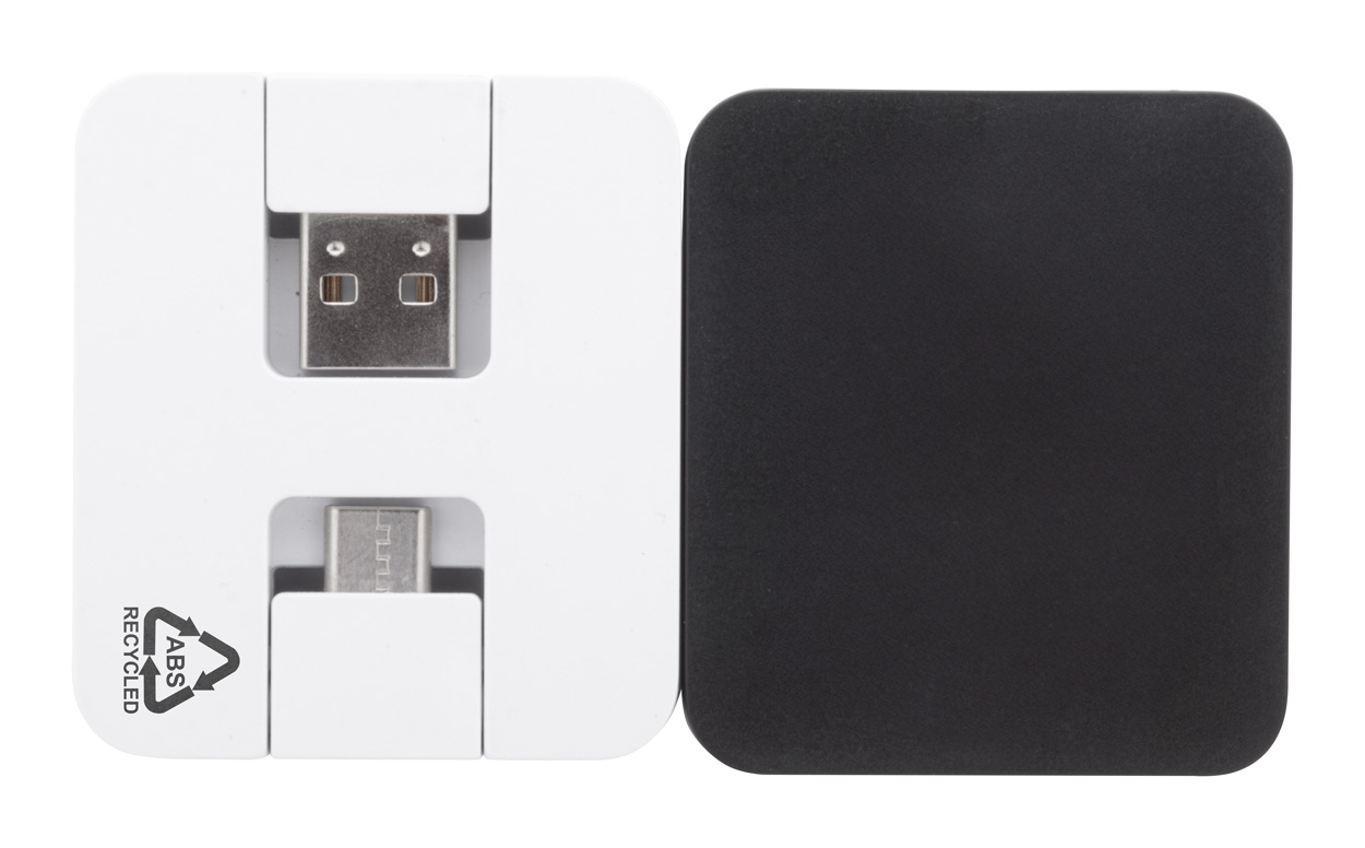 Recycled ABS plastic USB hub with 2 USB and 2 USB-C ports. With foldable USB and USB-C connectors. USB 2.0.