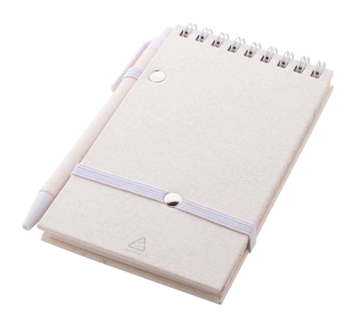 Recycled milk carton paper spiral notebook with hard cover and 70 lined sheets. With matching colour spiral rings, rubber strap and pen holder. Including recycled milk carton paper and recycled ABS plastic ballpoint pen with blue refill. A6 size.
