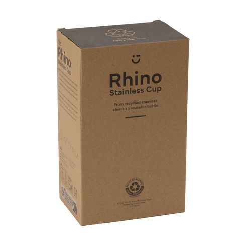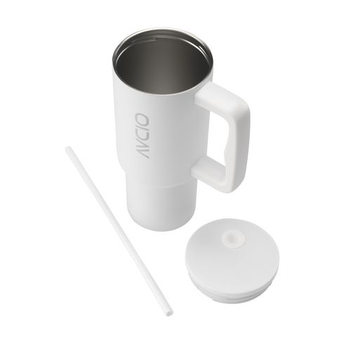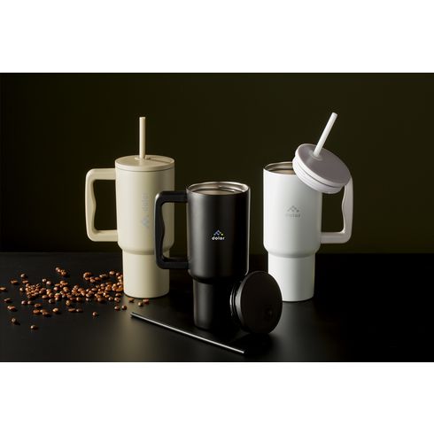 Large, double-walled drinking cup made from recycled stainless steel with straw. The striking, sturdy mug has a large, plastic handle and a screw-on lid with an opening for the included plastic straw. This huge mug keeps drinks at temperature for longer periods of time. Suitable for cold and hot drinks. Without a straw, the temperature is not lost thanks to the silicone seal in the lid. This mug can go anywhere. Ideal for the gym or the office. Thanks to the conical, narrow bottom, the cup fits in almost any cup holder, making it perfect for on the go. Not dishwasher-safe. RCS-certified. Total recycled material: 75%. Capacity 900 ml. Packed individually.