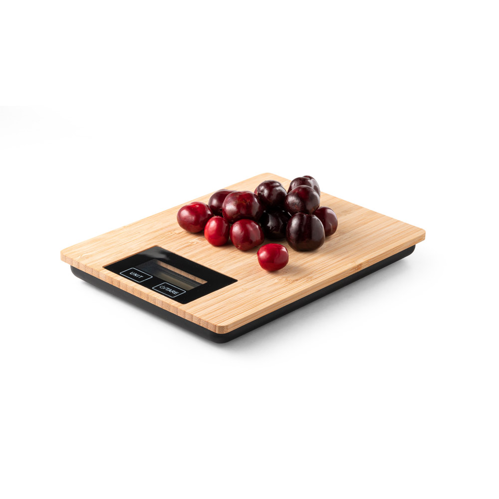 Bamboo digital kitchen scale with Tare function included. Weighing capacity up to 5 kg. Includes two AAA batteries. Supplied in a kraft paper gift box. As the product is made from natural materials, the colour and the printing result may vary between products. 145 x 200 x 17 mm