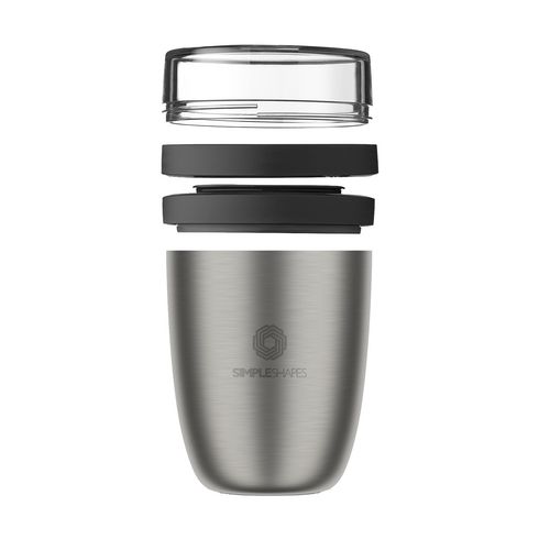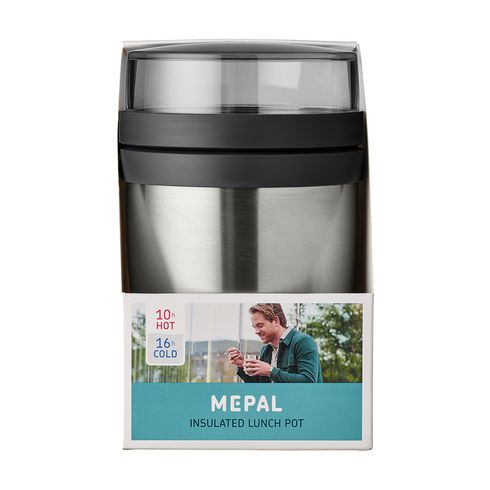 Double-walled, vacuum-insulated stainless steel food jar from the Mepal brand. Ideal for keeping yoghurt cool and soup warm. This leak-proof cup keeps your food warm for 6 to 8 hours and cold for up to 12 hours. A handy product for transporting your lunch or snack. The food jar has two compartments. You can separate the two with a twisting motion. Both parts have a separate lid. The ideal solution for preventing spills while mixing. The volume of the upper transparent compartment is 200 ml, which means that it holds about 75 grams of muesli, fruit or croutons. The volume of the bottom compartment is 500 ml, enough for a generous portion of soup, noodles or yoghurt. A premium high-quality product. Not dishwasher-safe. Comes with a 2-year Mepal manufacturer's warranty. Capacity 500 ml. STOCK AVAILABILITY: Up to 1000 pcs accessible within 10 working days plus standard lead-time. Subject to availability. Packed individually.