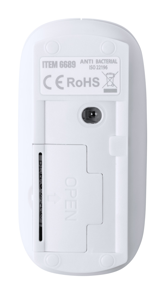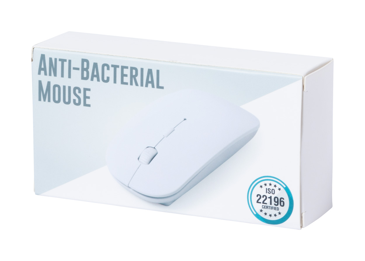 Antibacterial wireless optical mouse with plastic housing. ISO 22196 compliant. Operates with 2 AAA batteries, without battery.