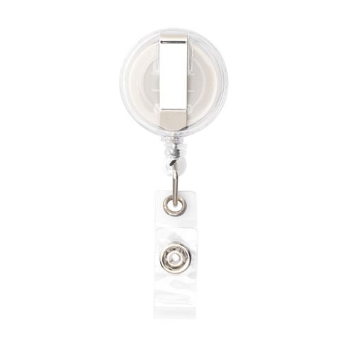 Badge/pass holder with metal belt clip, retractable nylon cord and press stud fastener.
