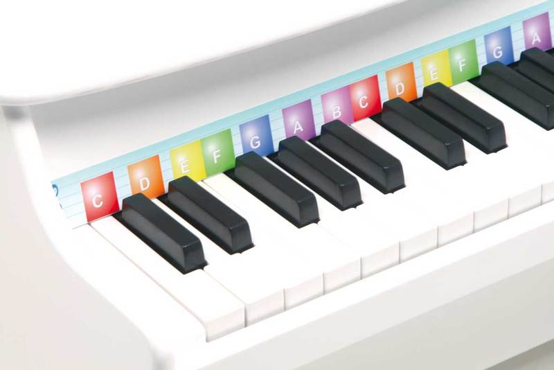 This white piano is a superlative musical toy! Budding pianists can discover their love of music and also learn to play some songs "by heart" thanks to the notes shown in coloured fields. The strong design and extensive tonal range are more than enough to make Mozart, Udo Jürgens or Jerry Lee Lewis stop by in the children‘s room!