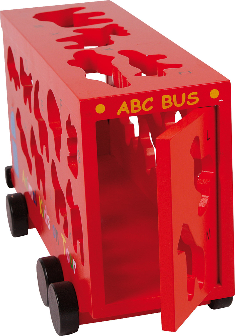 It is very easy to learn the ABCs - with this red bus, it's also a lot of fun! 26 colourful animal figures with letters and special shape can enter the bus! Trains motor skills and learning letters with ease, what more could you want!? This double-decker bus contains 26 coloured animal figures, which enter through the corresponding forms! Each form owns a letter from the alphabet (not corresponding to the name of the animal), trains the motor skills and teaches the ABCs.