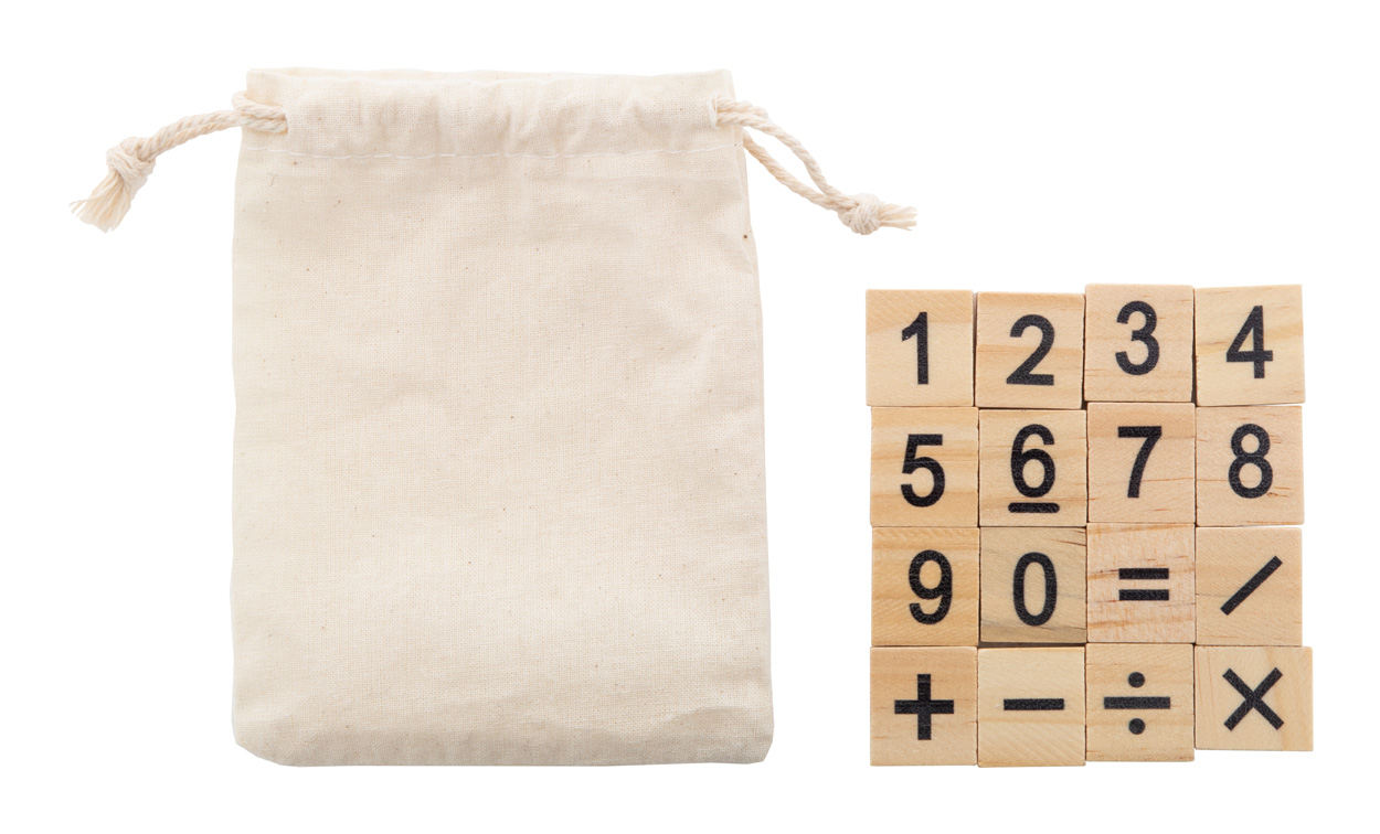 Wooden educational counting game in cotton drawstring pouch. With 32 tiles, including numbers and mathematical operation signs.