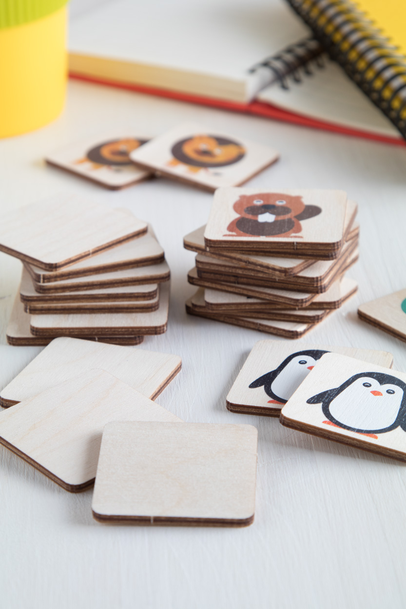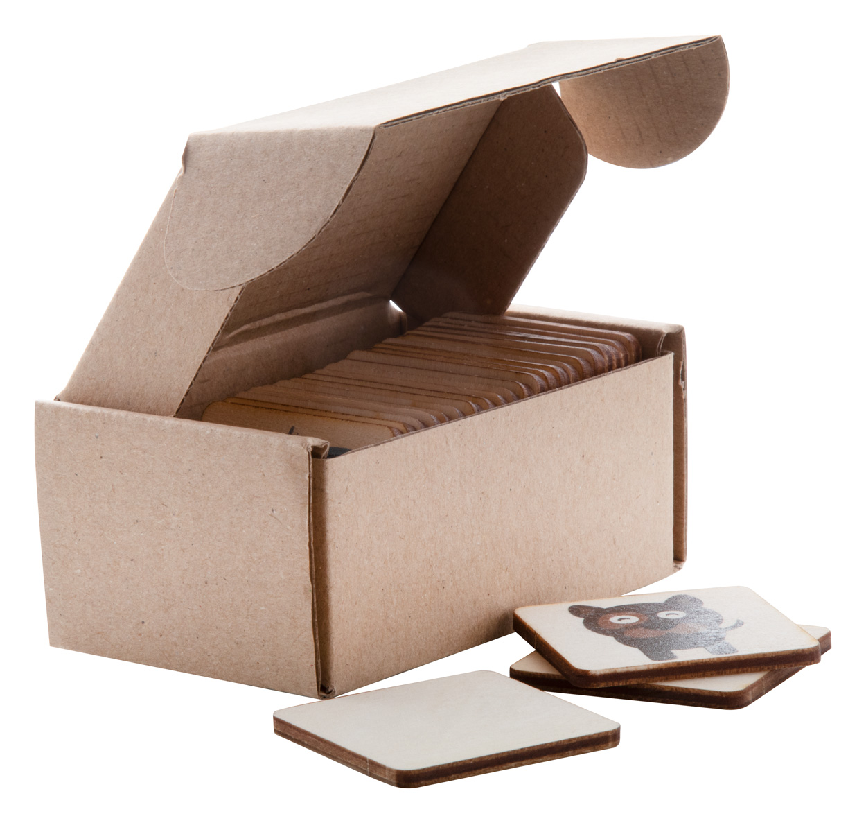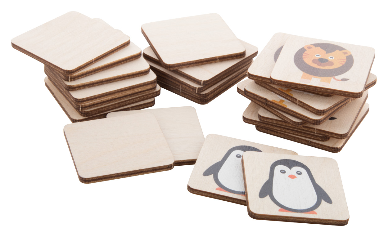 Laminated birch wood memory game with thematic motives. With 24 tiles (40x40 mm). Price includes 1 colour logo print on backside of all tiles. MOQ: 50 pcs.