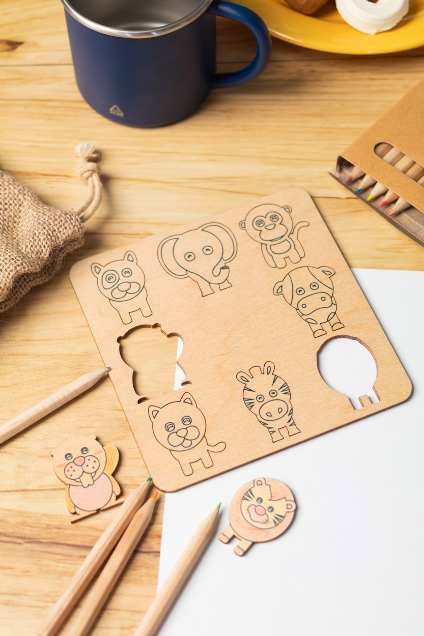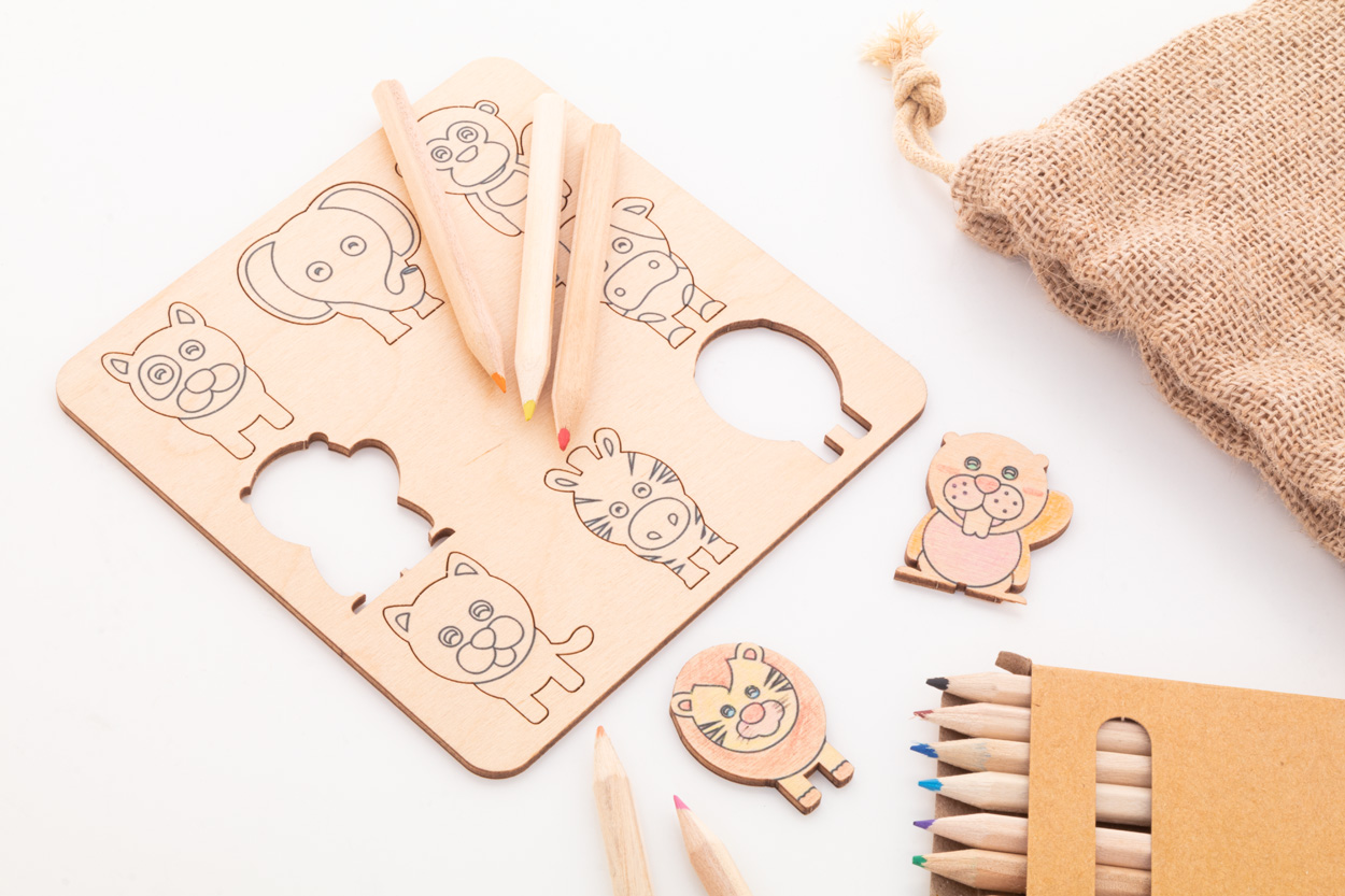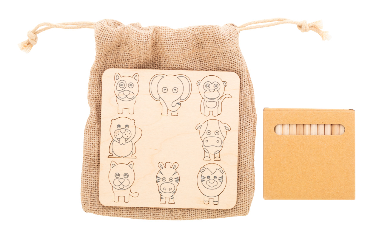 Colouring shape matching game in birch plywood with jute carry pouch. Includes thematic die-cut figures (8 pcs) and wooden coloured pencils (12 pcs) in paper box.