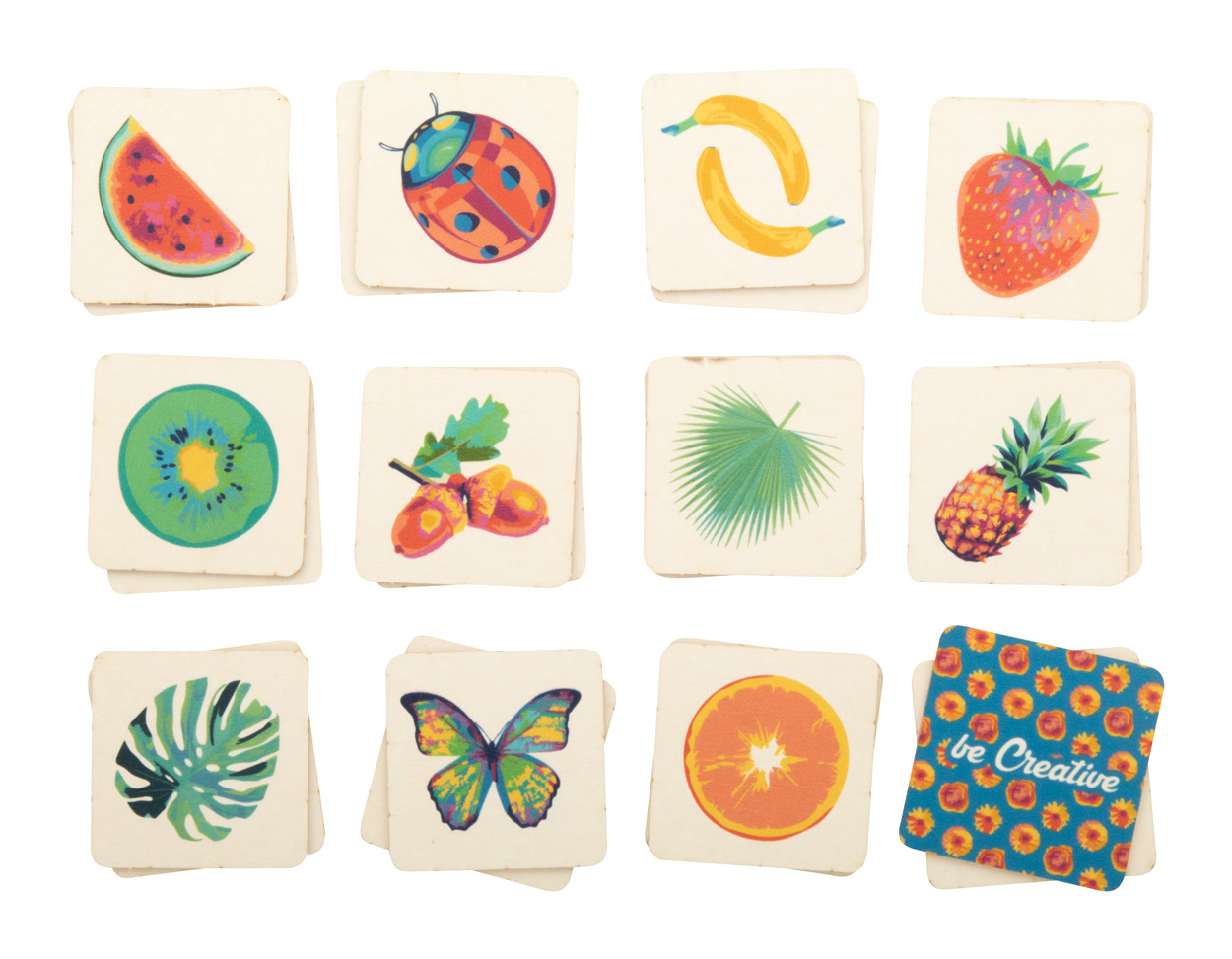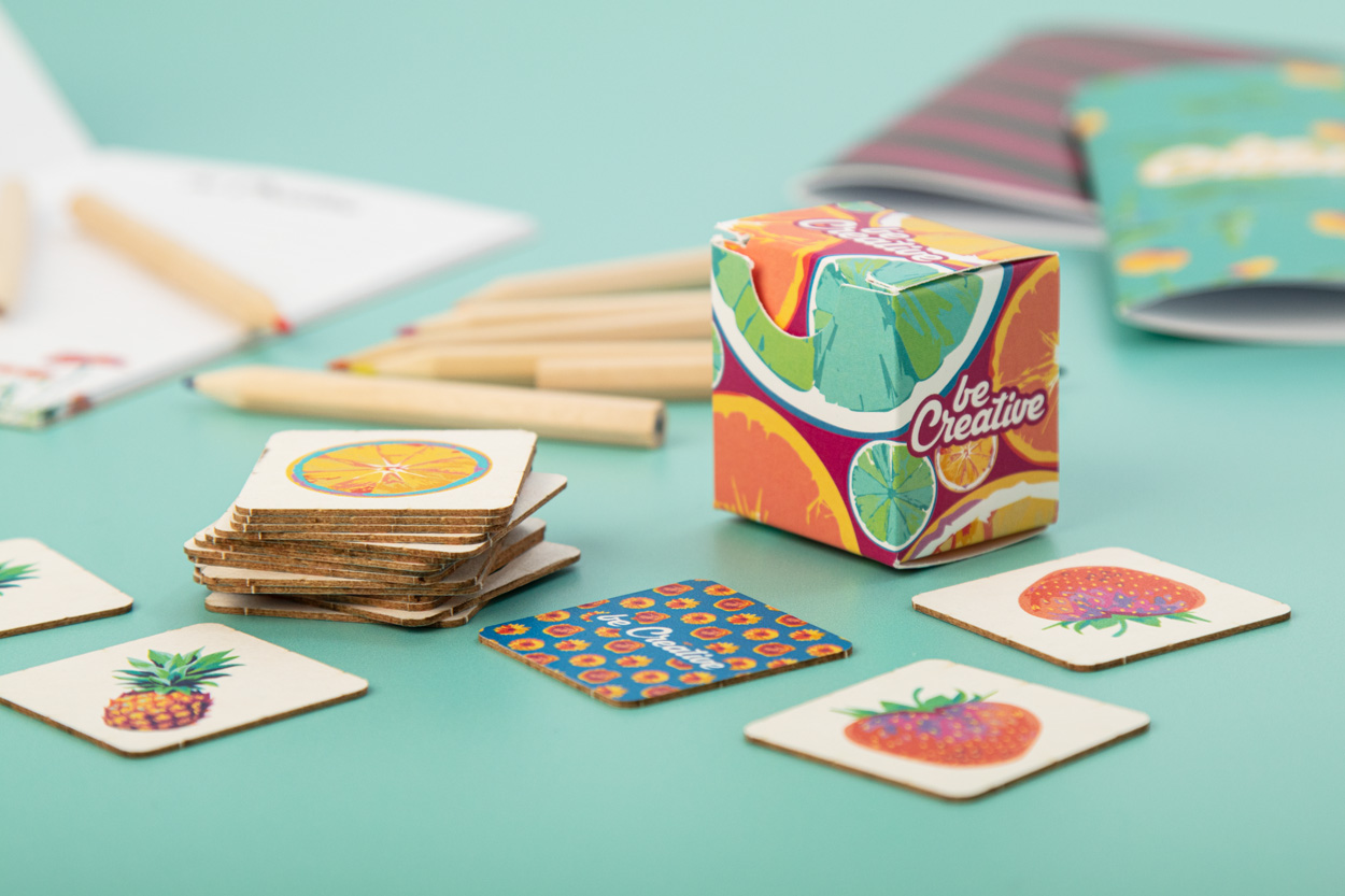 Paperboard memory game with thematic motives in custom paper box. With 24 tiles (40x40 mm). Price includes 12 different full colour print on front side of tiles, 1 full colour print on backside of all tiles and a full colour printed box. MOQ: 250 pcs.