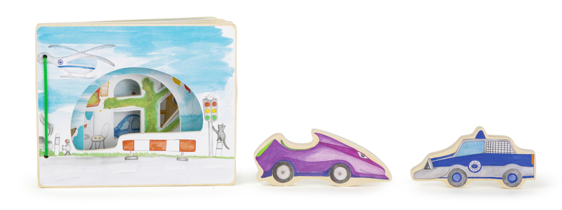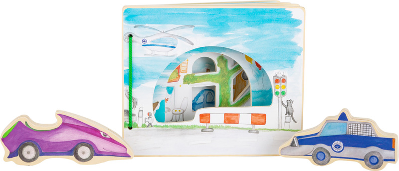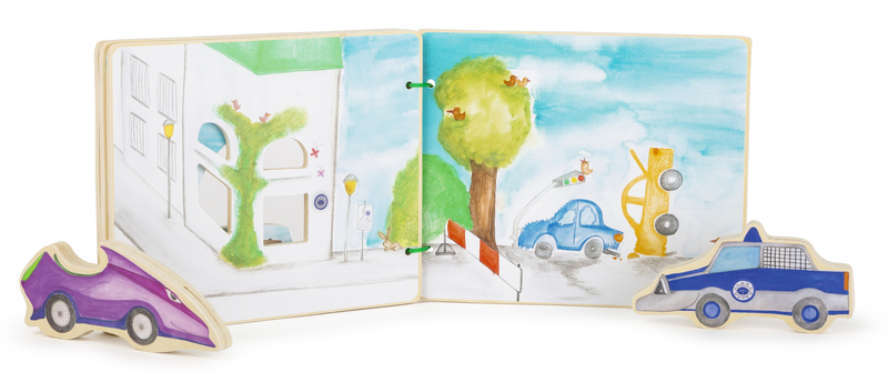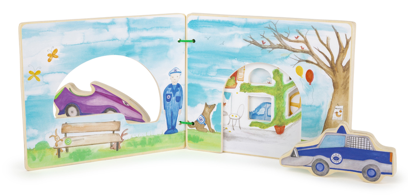 Screen Printing| Dimensions | Wooden book approx. 18 x 15 x 2 cm Police car approx. 11 x 6 x 1 cm |