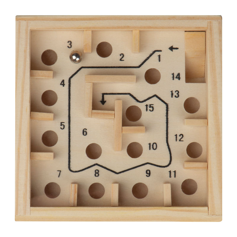 Wooden maze puzzle featuring a metal ball.