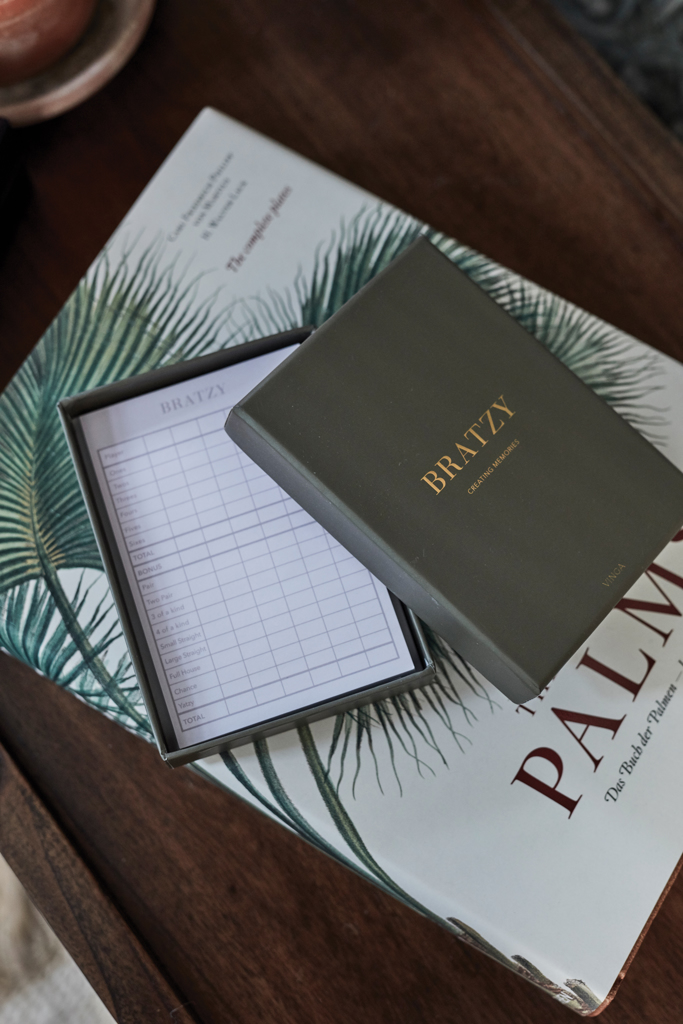 This is Yatzy in a luxurious packaging! With golden dices, and an equally exclusive pencil, we jack up Yatzy to Bratzy. This game is delivered in a stylish box, with a golden text printed on it, which makes it both fun to give away, and to use as a nice detail on the coffee table.