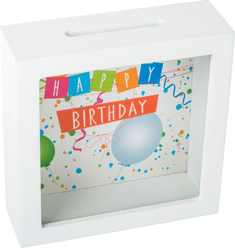 Happy Birthday! This wooden picture frame is a neat combination of a viewing window, a savings box and a picture frame. Suitable for setting on a flat surface or hanging. Whether it?s used as wall decoration or a savings box - this picture frame is an absolute eye-catcher! The money is inserted directly into the opening and can be easily retrieved again from the rear side. The dutiful saver has his "holdings" always in view with the plastic viewing window.