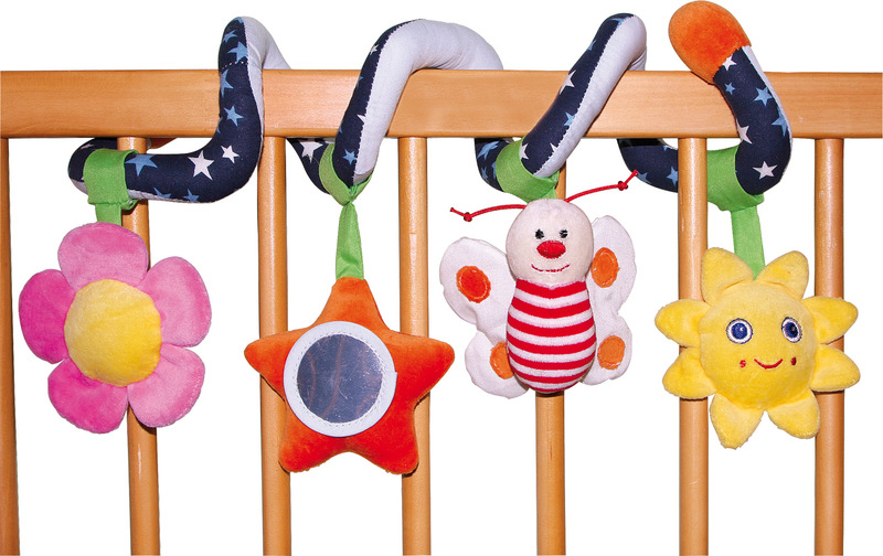 4 soft, funny coloured motifs are fixed on a textile spiral. They stimulate the grip reflexes and with the different noises and the mirror foil they sharpen the minds of the little children!