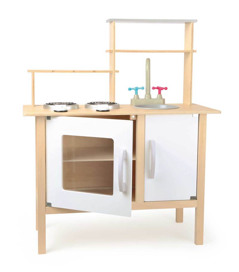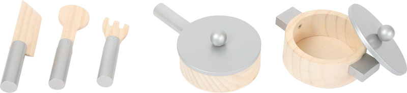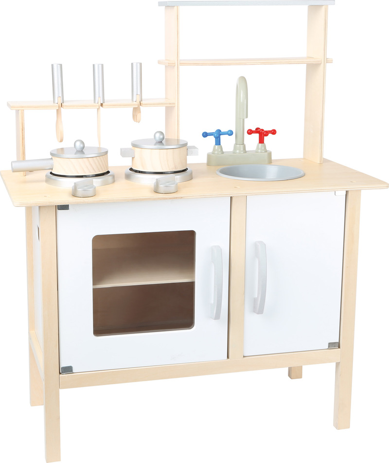 Attention all top chefs! This functional play kitchen impresses with its working cupboard doors, a gas range with clacking knobs, kitchen utensils to hang up, wooden pots with removable lids, and grips on the side to transport the kitchen. This wooden play kitchen is a real eye-catcher in the children's room. The stable wooden foundation and a multitude of practical kitchen utensils make this play kitchen a real cooking experience for children. Now they can really fire up the stove and get cooking!