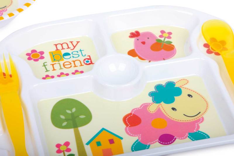 Pad Printing| Dimensions | Tray approx. 30 x 22 x 2 cm; bowl: ? approx. 15 cm; mug: approx. 7 cm; spoon/fork: approx. 16 cm |