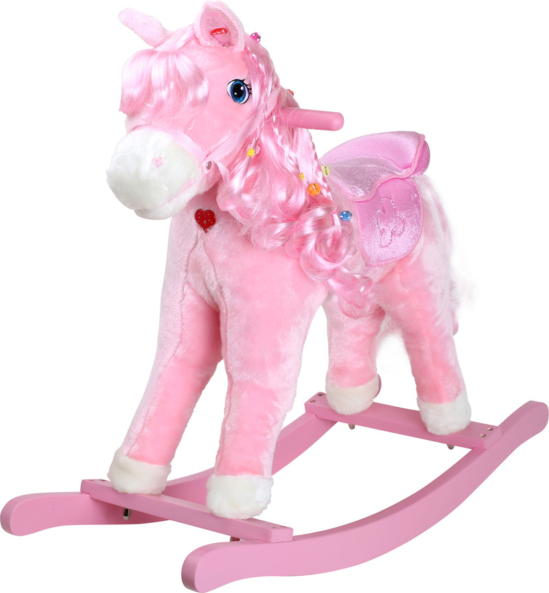 This cute and cuddly rocking pony moves its mouth and makes neighing noises when you press the button in the ear. The mane can be tamed with the hair clips included. And the very special extra feature: on its neck is a heart that lights up to show the children how much the pony loves them! Batteries not included.