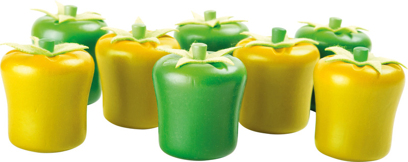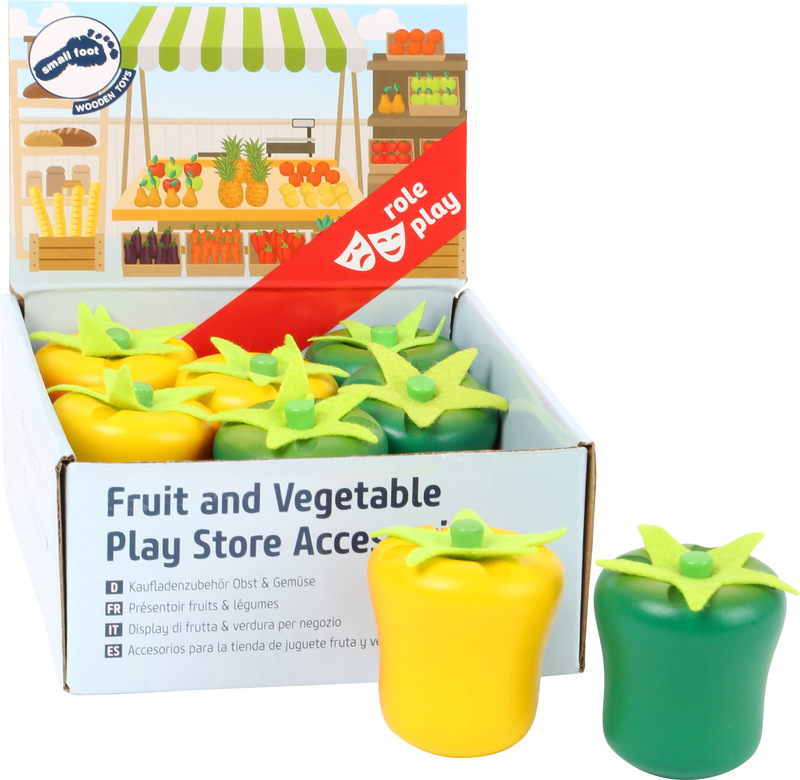 Set of 8. Every playroom shop needs healthy fruit and vegetables.Made of robust wood in bright colours it can be effectively displayed at the cash desk in the displays or placed in the matching wooden shelf.