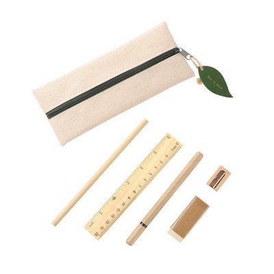 School set in zipped cotton pencil case, pencil (unsharpened), ball pen, ruler, eraser and pencil sharpener