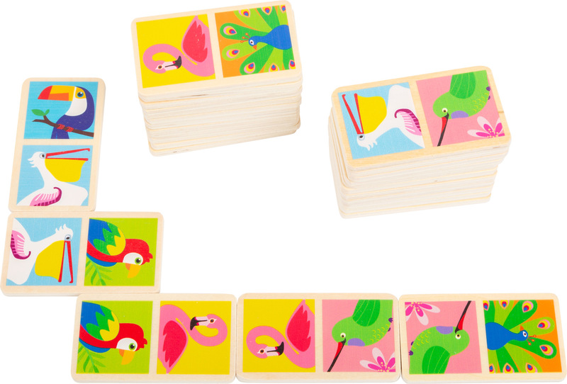 Parrots, flamingos, peacocks and all their friends decorate this appealing dominoes game made of FSC? 100%-certified wood. The game pieces in this 28-piece set have rounded edges and have colourful birds from around the world printed on them, allowing the children to playfully discover what brightly-coloured creatures our world of animals has to offer. Whoever sorts all the picture pairs from their pile correctly is the winner. Who can lay their domino piece next?