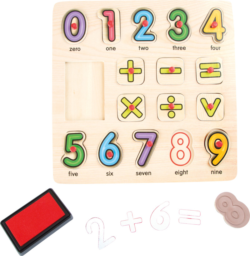 Children will enjoy learning arithmetic with this stamp set made of wood. Different sums can be made with the numbers one to nine, and with the red stamp pad the numbers and signs are even easier to read.