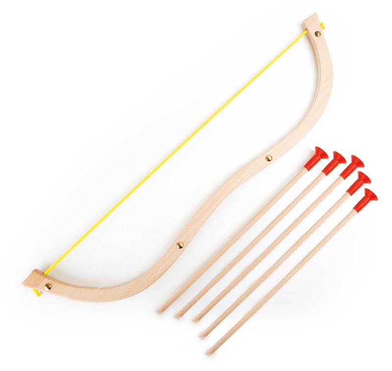 along their way. Out hunting with bow and arrow. Both are made of robust, high-quality wood and fit well in the hand. The 5 supplied wooden arrows can be placed with the notch at the top end into the strong, elastic rubber band. Take aim ... shoot!
