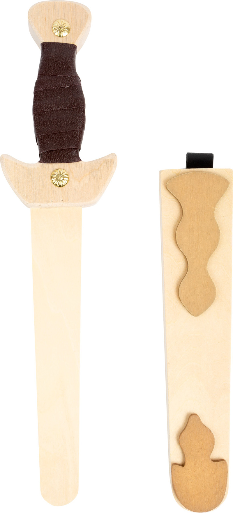 This beautifully shaped wooden dagger is a real eye-catcher! With a handle wrapped with a leather band, it fits great in the hand and is manufactured very well. A wooden sheath decorated with appliqu?s completes this two-piece set. Thanks to the rounded edges of the blade, nothing can go wrong during active role-playing. In addition, this dagger is a great accessory for playing dress-up or Shrovetide costumes! All the other knights will gawk at this one!
