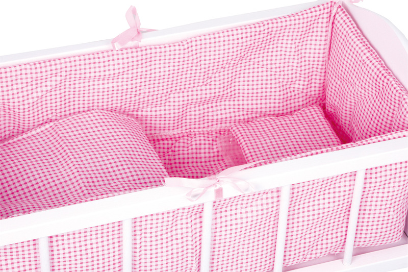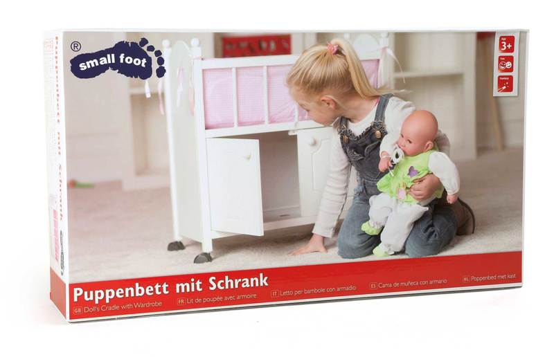The doll?s bed in white varnish with its combined base cabinet provides for a space-saving stowage. The pink skirting and the pillow complete the nice piece of furniture.