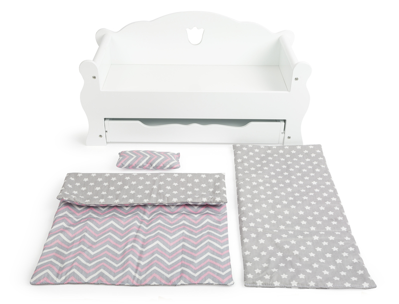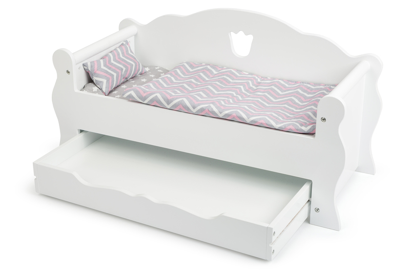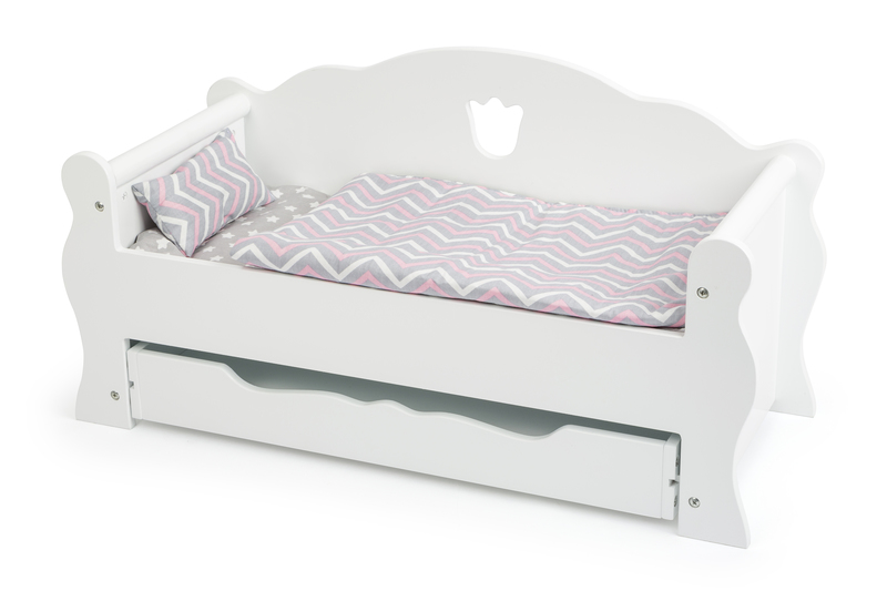 Now it's getting comfy! This doll's bed can be transformed to a comfy sofa. The practical drawer can not only store the cute bed linens, but also can be used as a second sleeping spot. Dolls will feel right at home on the cute day blanket, and can relax after a busy day in the children's room. This bed can be easily moved by children with the practical side bars! Who wants to take a seat next?