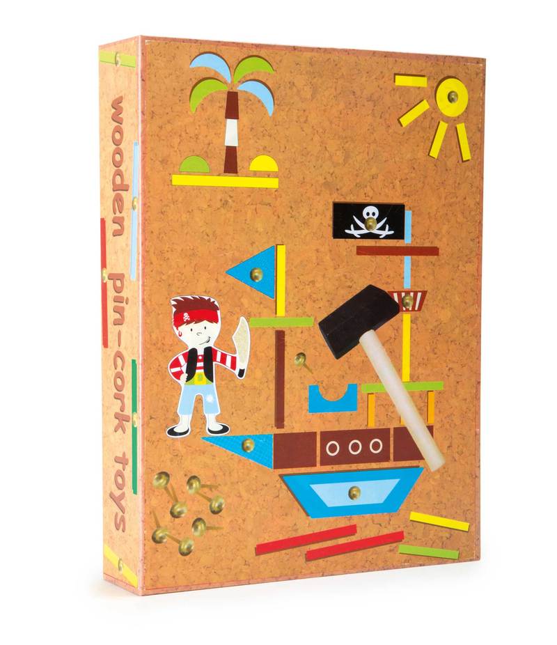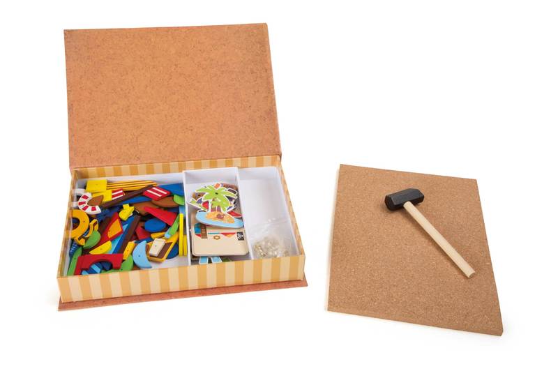 With this hammer game various pirate motifs can be hammered on a cork board. Four cards suggest motifs for a picture. It is packed in a box and easy to store.