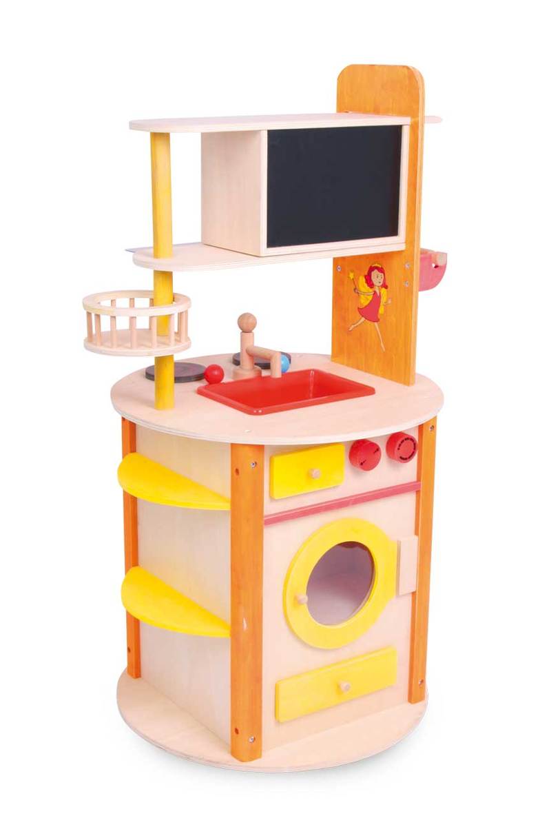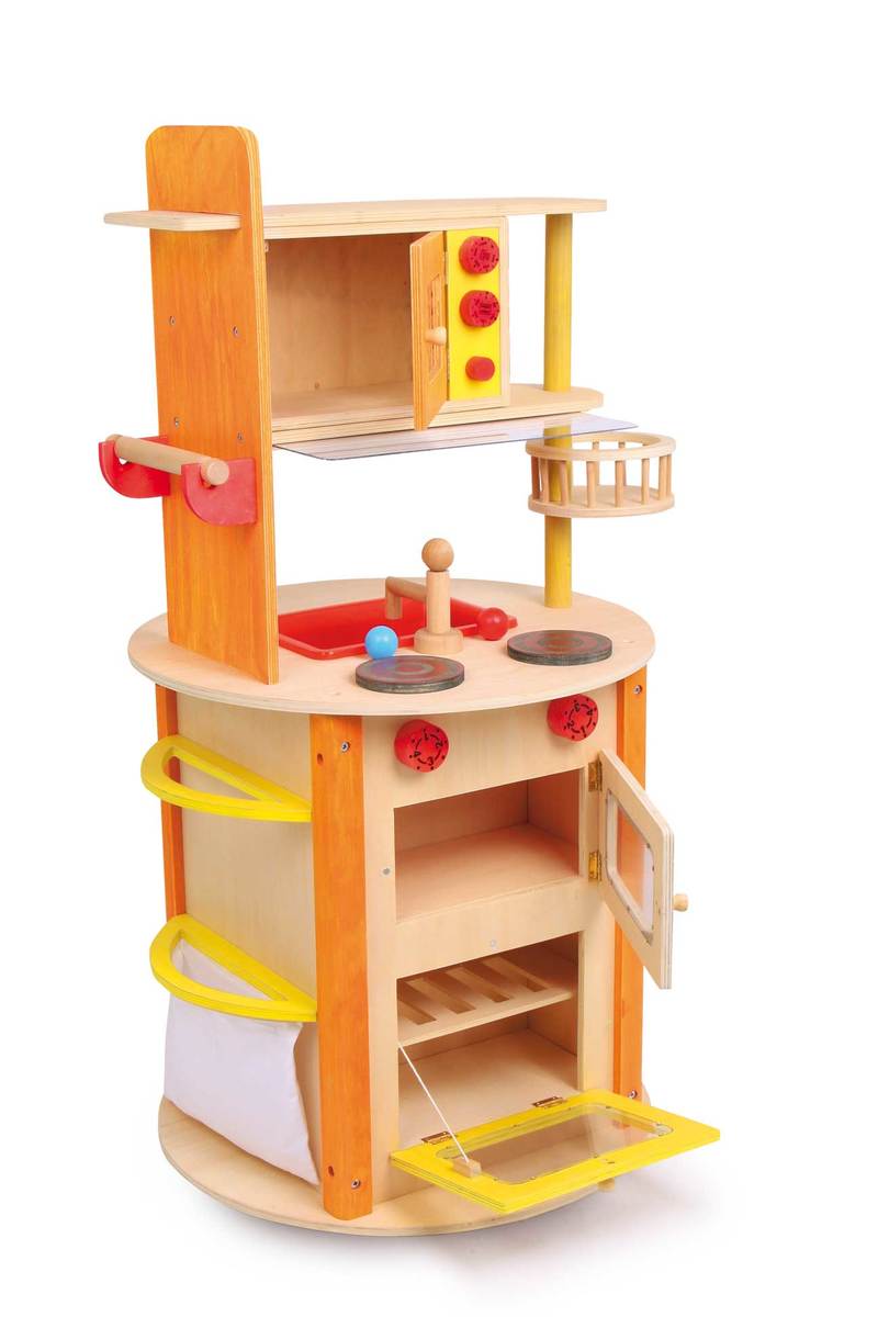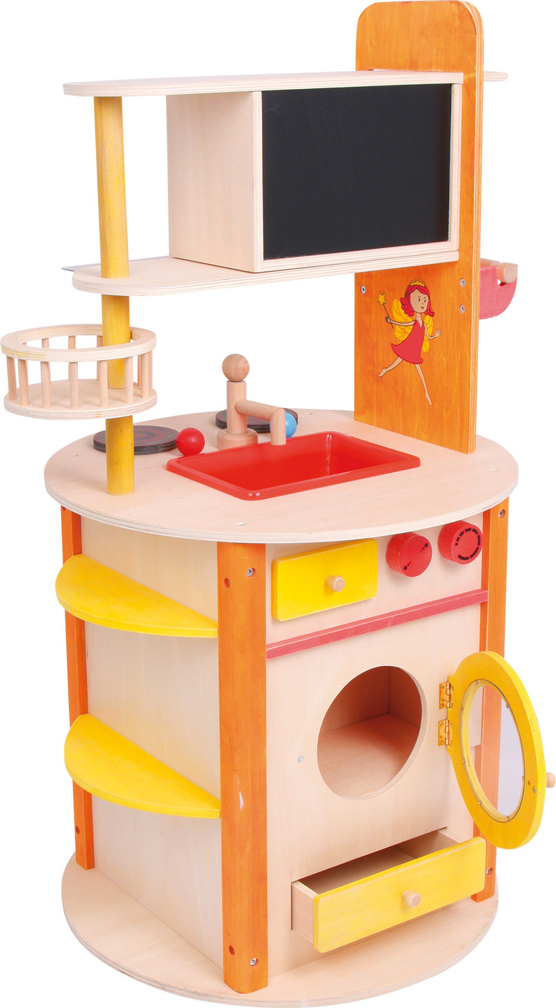 A fantastic toy kitchen! This kitchen is made of sturdy plywood and provides a lot of creative playing opportunities. Equipped with turnable knobs, microwave, sink, cooker, oven, washing machine and rotatable shelf – the sky is the limit! To complete this all-around kitchen a blackboard for notes, a holder for rolls of paper, textile bags for accessories, shelves, drawers and a towel rack, offer space for many accessories from our range! Tremendous playing pleasure in the smallest space!