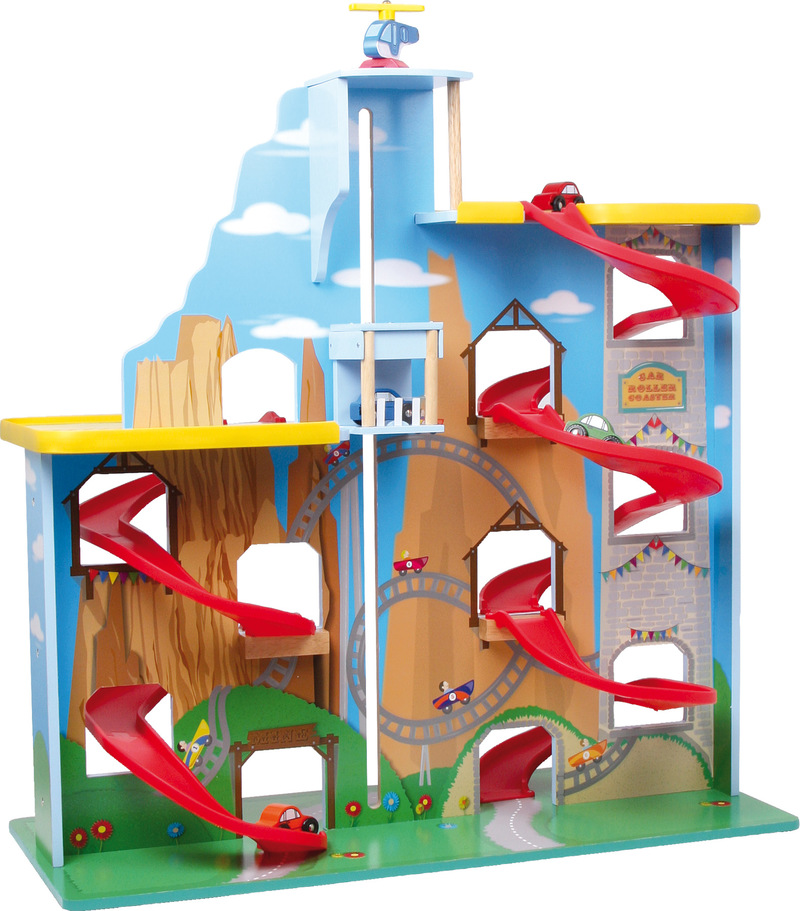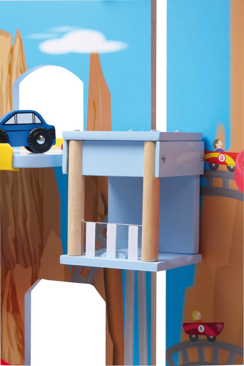 Car amateurs! The extra-large parking garage with its very stable boards and colourful detailed motifs makes cars go through various levels or by using an elevator that will lift them up! The infinitely smooth track allows children to be really operative. Incl. 5 vehicles in brightly painted wood. Here is the ultimate creative enrichment ensuring hours of play fun!