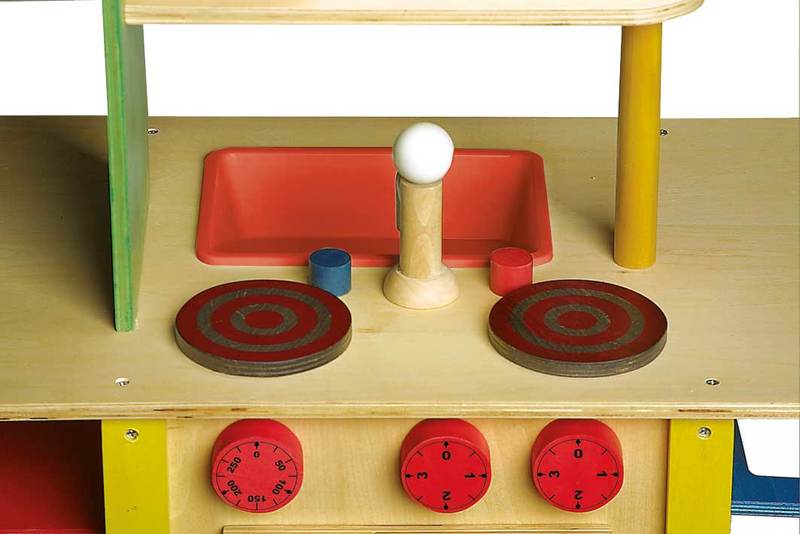 Lots of fun to play in so many different ways. With washing machine, cooking range and sink. Extra fittings for kitchen tools and dish towels. Controls with sound effect and flaps with magnetic fastenings.