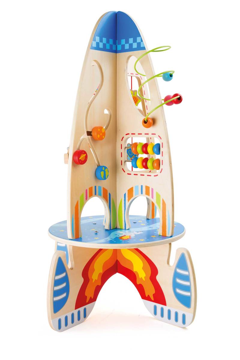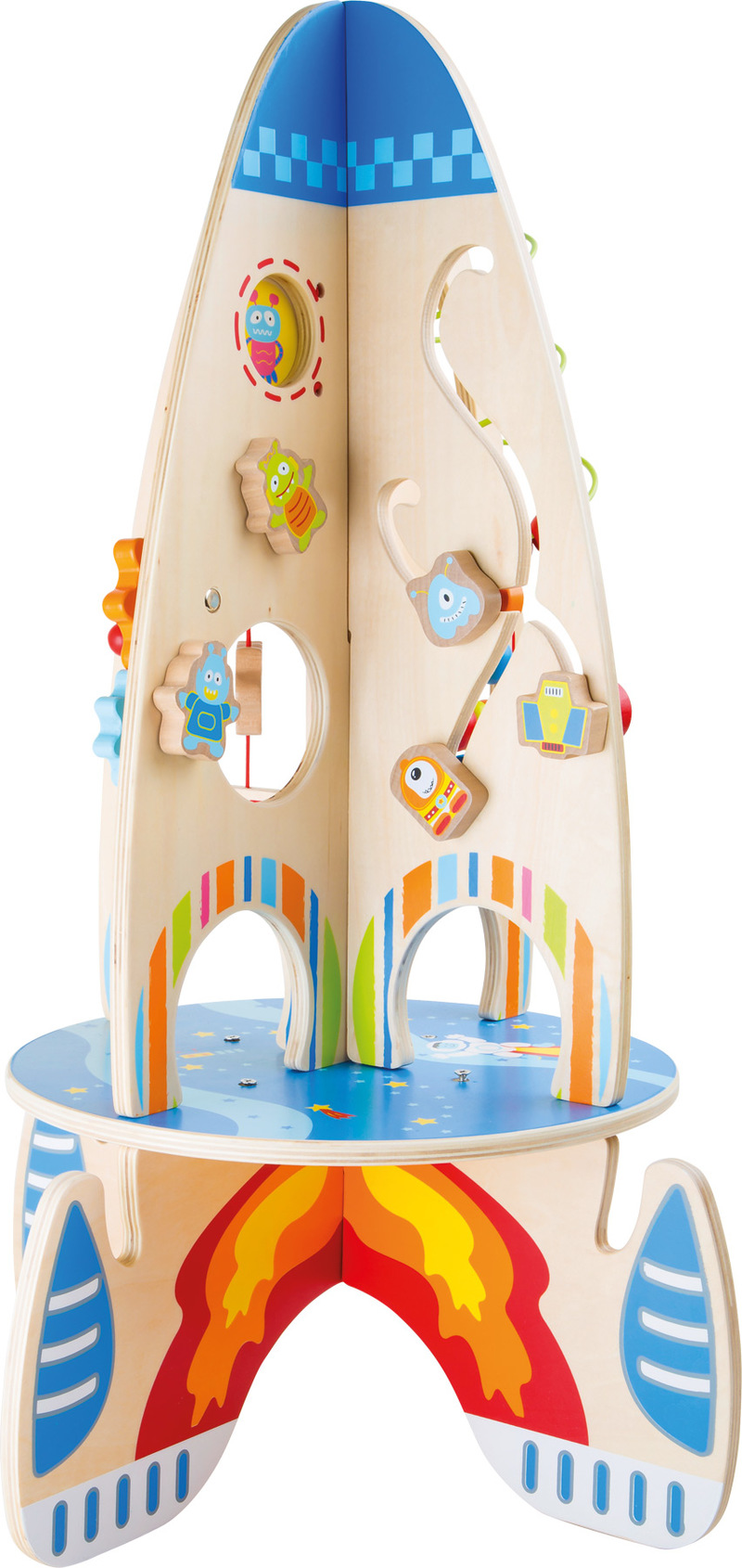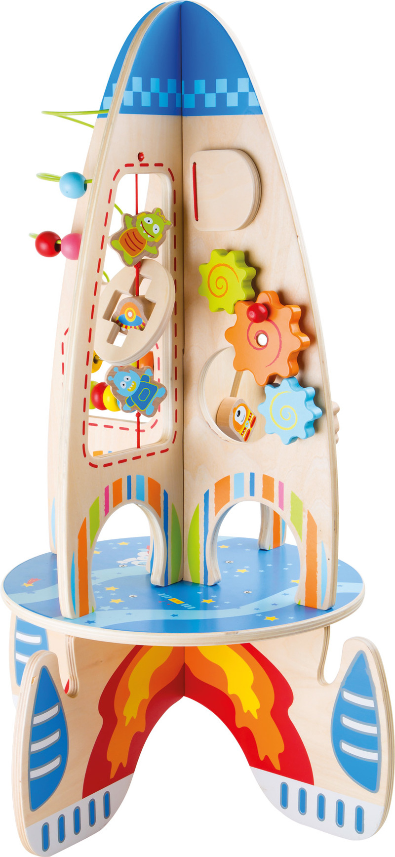 Ten, nine, eight...It might not be on the moon, but this motor skills trainer in the shape of a rocket makes a particularly good impression in the children´s room. The high-quality, colourfully lacquered solid and laminated wood contains numerous small stations for diverse playtime experiences. Activity loops, beads, pushing elements and gears are waiting for curious eyes and hands. There certainly won't be any boredom here - friends can also find space on this motor skills rocket that looks great on either the floor or a table. This motor skills toy is great for practicing and promoting gross and fine motor skills, and belongs in every children's room!