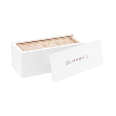 den stacking game (48 blocks). Tower dimensions 16.5 x 6 x 6 cm. Presented with a white, wooden box with sliding opening for easy storage. Incl. instructions. Packed individually.