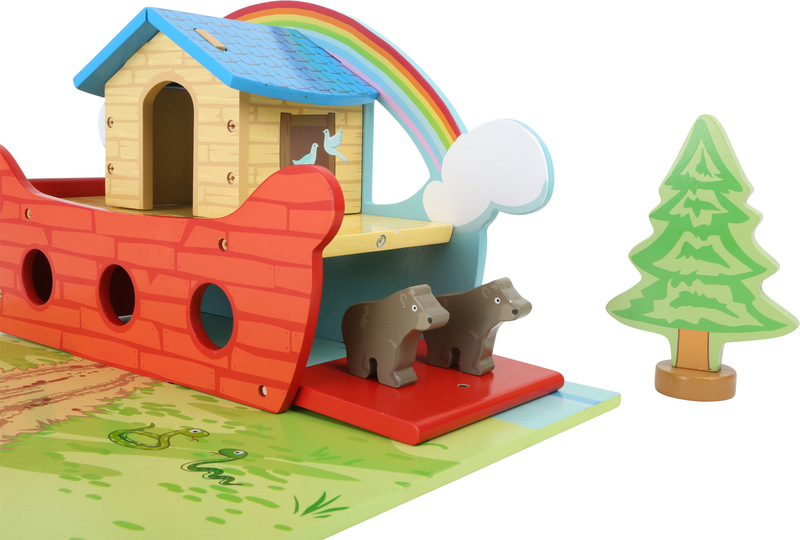 Noah?s Ark is ready to take in all accurately detailed animals that want to rescue themselves from the great flood. It stands on a large wooden game board and waits for all the animals to climb into the ship via a yellow stairway. With its simple push-fit design, the wooden ship can be assembled and fastened on the wooden board quite easily.