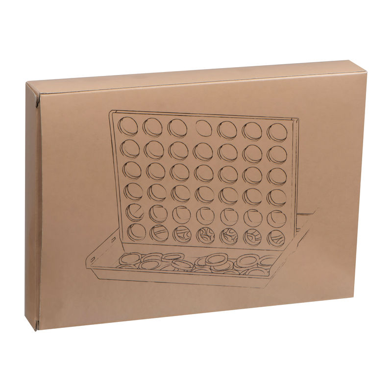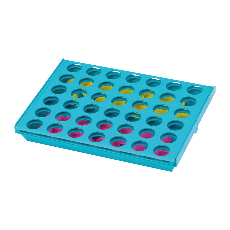 4 in a Row featuring yellow and pink gaming pieces. The foldable playing field is ideal for both home use and travel.