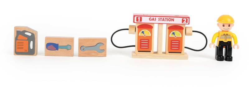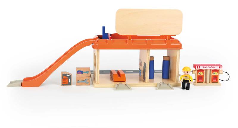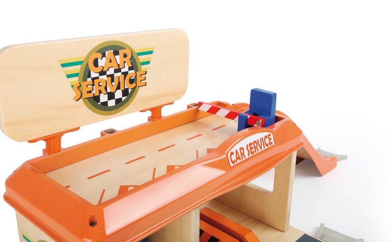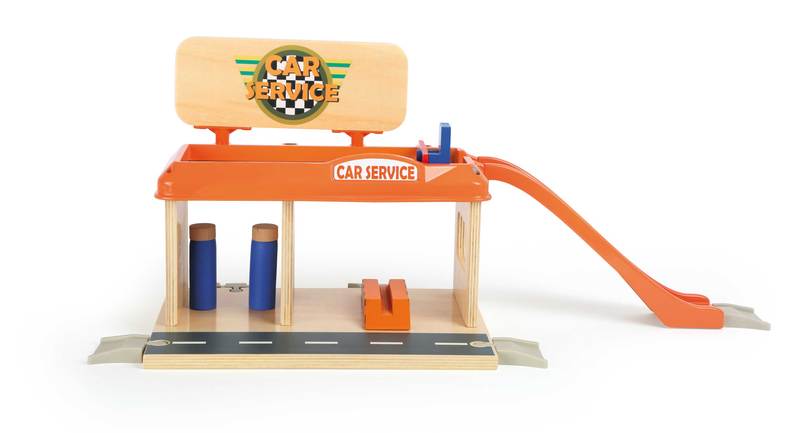 Here, it's all about service with a smile! Aspiring young auto mechanics will definitely get their money's worth with this auto repair shop from our small foot world playworld! This auto repair shop made of wood and stable plastic parts comes with a car wash, a mechanic, a taxi, tools, and an auto lift. And here's a special highlight: the tank nozzles are attached with a magnet and can be removed from the petrol pump - just like at a real petrol station! So let's go: park the taxi on the roof and open the gate to drive down the ramp. The mechanic will check your car on the auto lift, makes repairs with his screwdriver and wrenches, and as a special service, you get a free car wash. Then, off you go with a full petrol tank! Thanks to the many different ways to play with it, including together with other small foot world products, this auto shop is a real winner in the children's room!